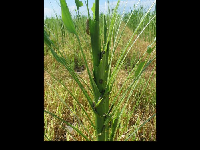 Champ de maïs sévèrement endommagé par la légionnaire uniponctuée : ce ravageur est principalement associé aux plantes de la famille des graminées. Il s’attaque principalement aux céréales et aux maïs, mais peut se retrouver sur une multitude de plantes horticoles ainsi que de mauvaises herbes. Les dommages sont causés par les larves qui grignotent les feuilles, causant parfois une défoliation très sévère des plants.