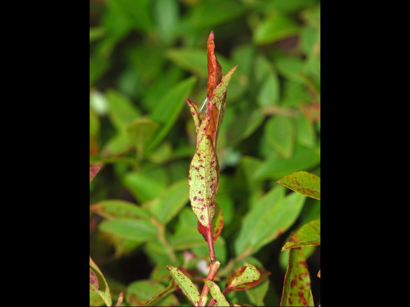 Description: Tige de bleuet présentant des dommages causés par des larves de la tordeuse du bleuet. Cette espèce grignote la surface des feuilles entre les nervures. Les larves se forment un abri composé de feuilles squelettisées brunes et desséchées à l'aide de toiles tissées. L'abri s'agrandit progressivement à mesure que la larve se nourrit et croît. Les plants endommagés sont visibles de la mi-août jusqu'à la fin de l'automne.
