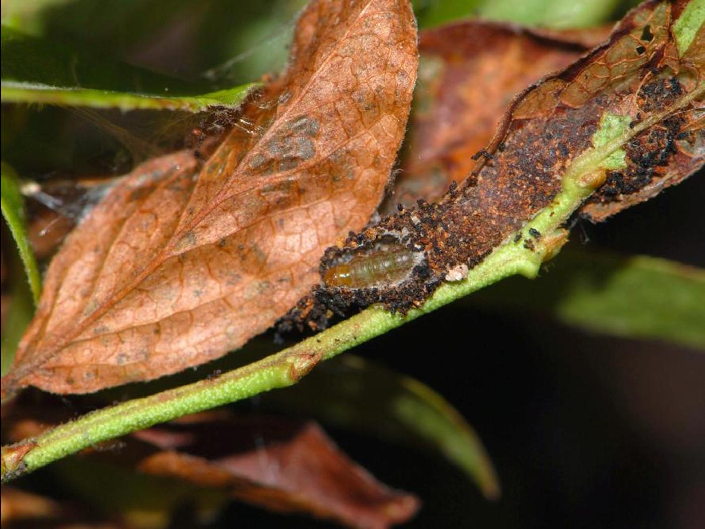 Description: Tige de bleuet présentant un abri construit par la tordeuse du bleuet et ayant été ouvert pour y observer une larve et des excréments. Cette espèce grignote la surface des feuilles entre les nervures. Les larves se forment un abri composé de feuilles squelettisées brunes et desséchées à l'aide de toiles tissées. L'abri s'agrandit progressivement à mesure que la larve se nourrit et croît. Les plants endommagés sont visibles de la mi-août jusqu'à la fin de l'automne.