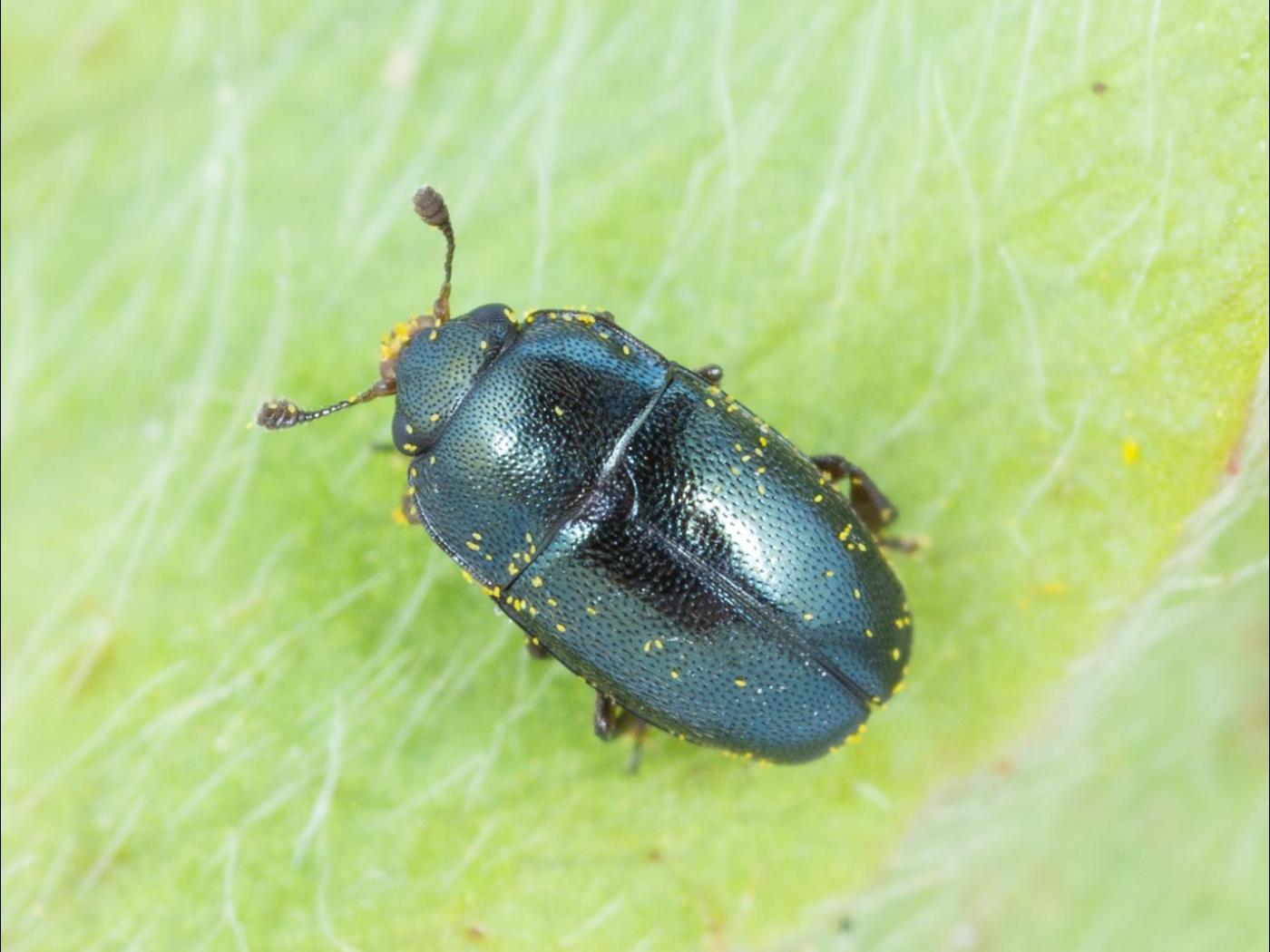 Adulte : 1,5 à 2,5 mm; le corps est de forme ovale et présente une coloration noire avec des reflets bleutés; la tête, le thorax et l’abdomen sont recouverts d’une fine ponctuation; l’extrémité des antennes est en forme de massue.