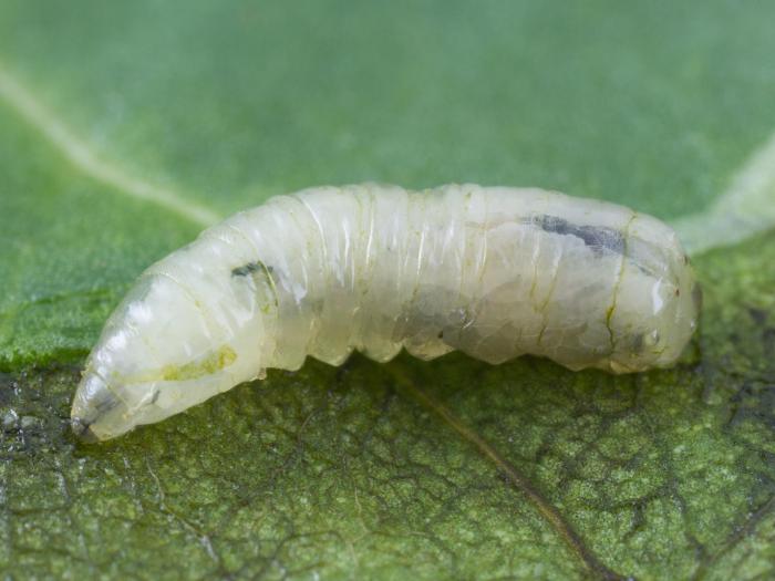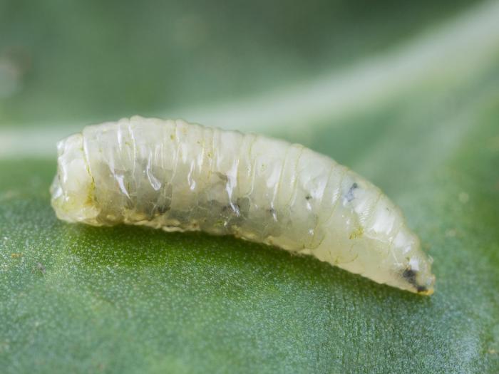 Larve : 7,0 à 9,0 mm à maturité; le corps est blanc jaunâtre et cylindrique, se rétrécissant dans sa portion antérieure; les pièces buccales noires sont visibles à l'intérieur de la tête; les stigmates antérieurs comportent de six à huit digitations.