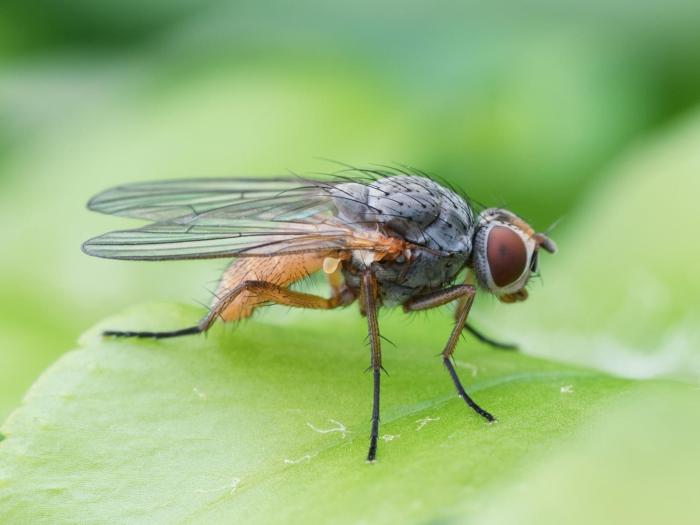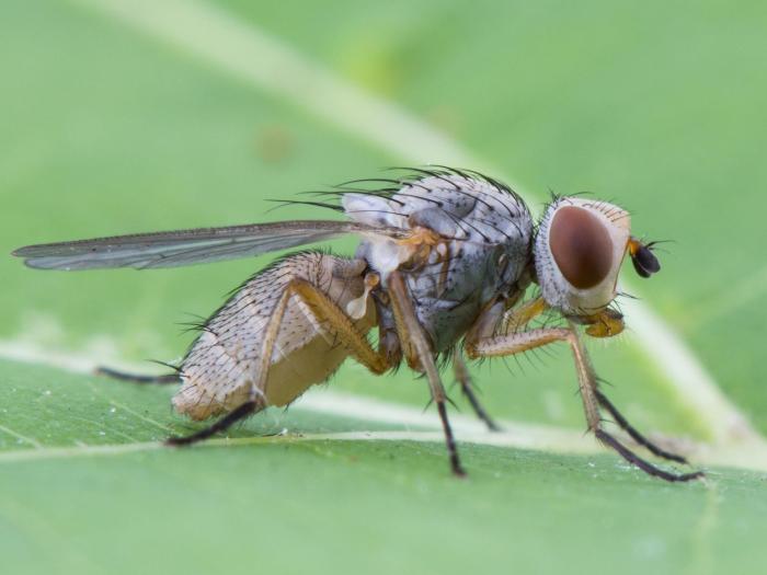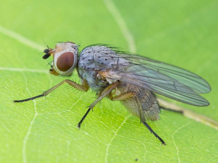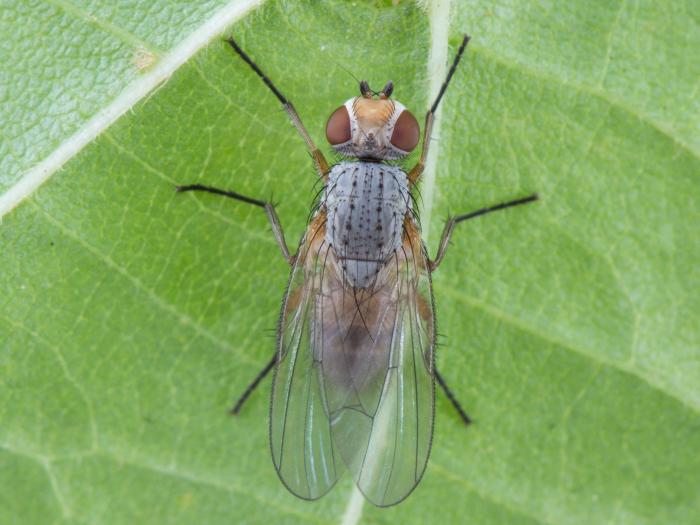 Adulte : 6,0 à 7,0 mm; le corps est gris et est recouvert de longues soies noires; les yeux sont rouge foncé; les pattes sont jaunâtres avec des tarses noirs.