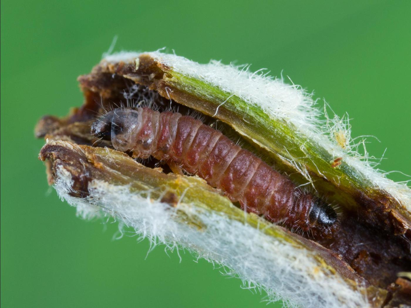 Chrysalide : 5,0 à 6,0 mm; la cuticule est brun doré et plus foncée au niveau de la tête; deux petits crochets sont présents à l’extrémité de l’abdomen.