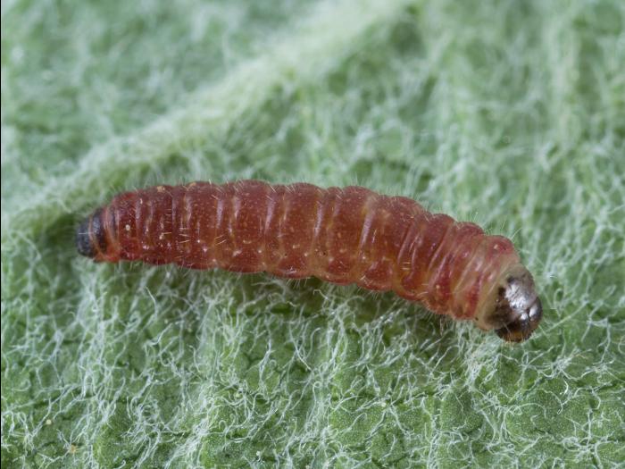 Larve : 8,0 mm à maturité; la tête est noire; le corps est rose brunâtre et est recouvert de petites soies pâles; la plaque anale est foncée.