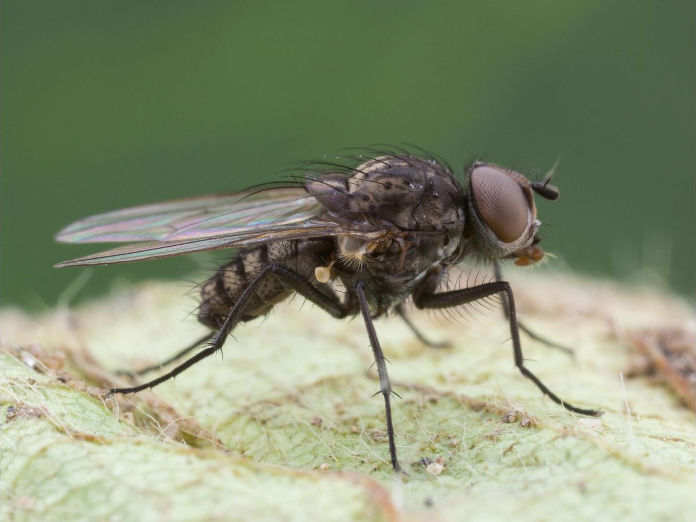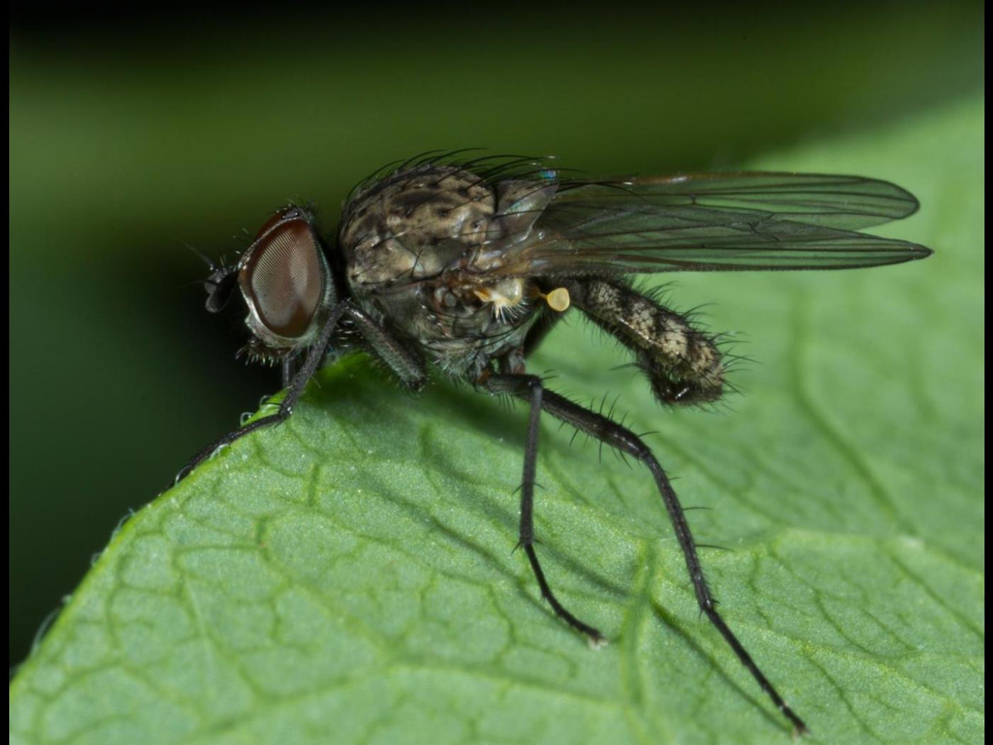 Adulte : 5,0 à 7,0 mm; il est semblable à une mouche domestique; le corps est gris pâle et recouvert de longues soies noires; les pattes longues et noires portent de longues soies; les ailes se croisent au-dessus de l'abdomen en position de repos; cette espèce est très difficile à différencier des autres mouches du genre Delia.
