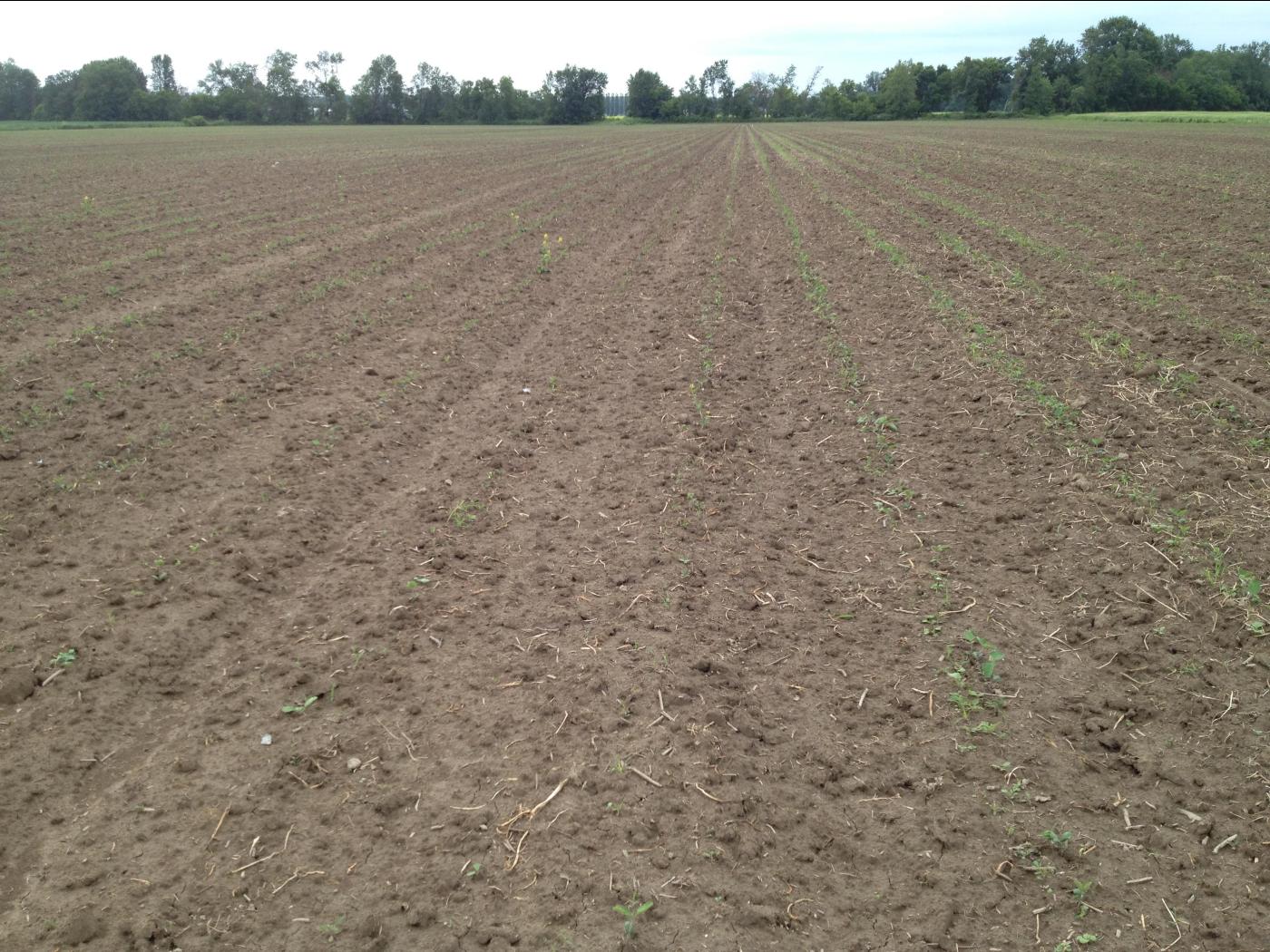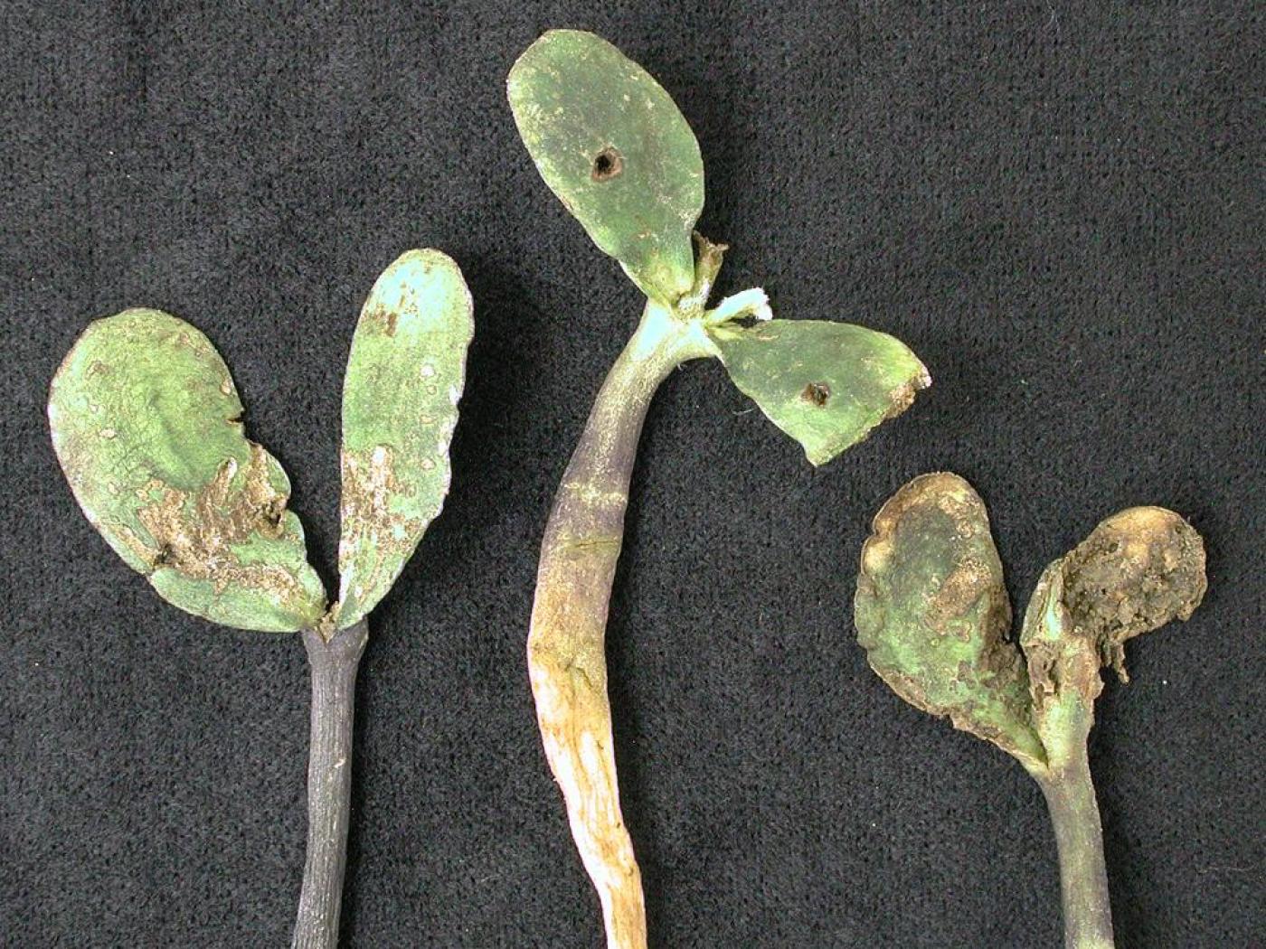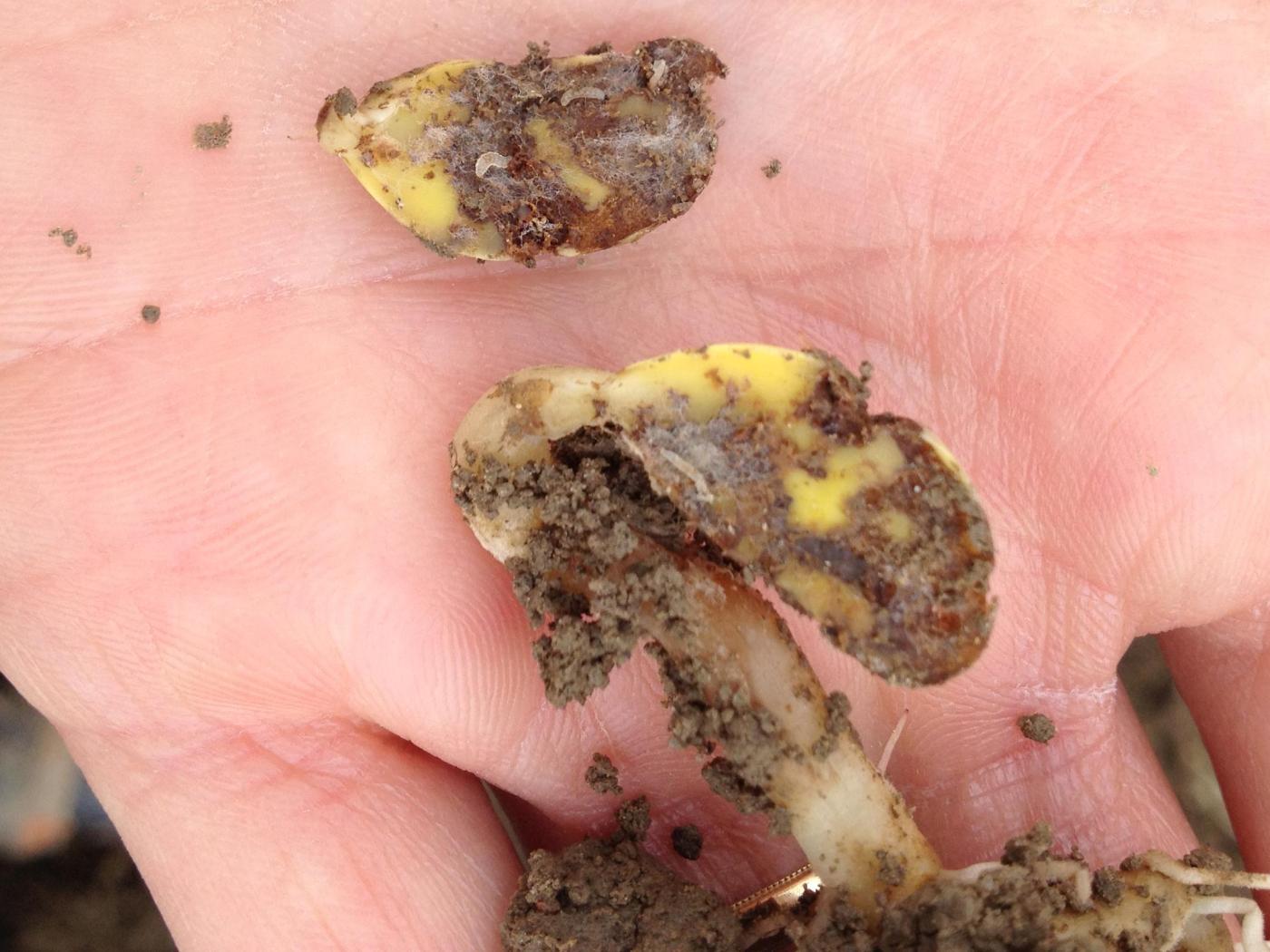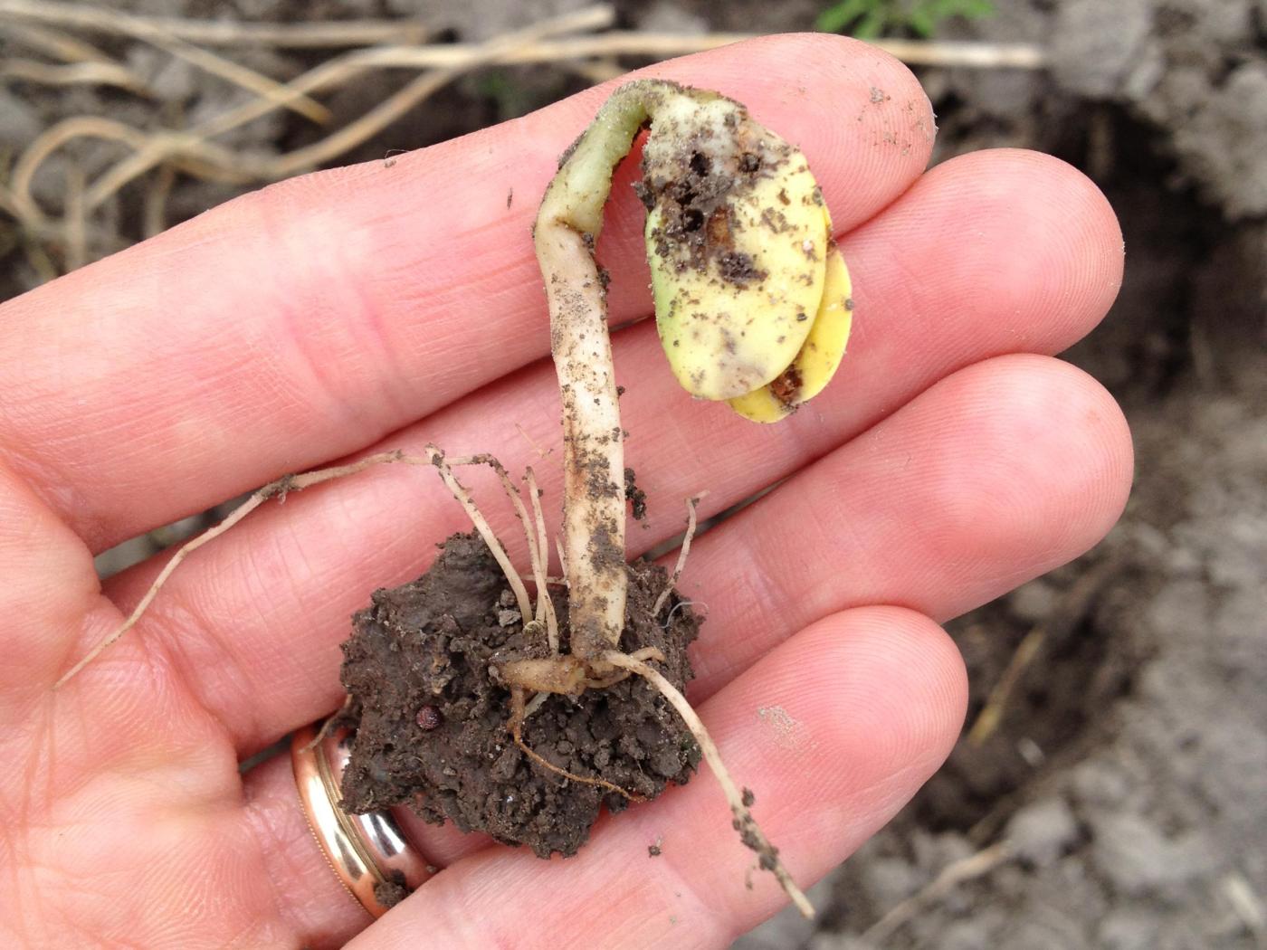 Légende: Dommages causés par la mouche des semis sur des plantules de soya