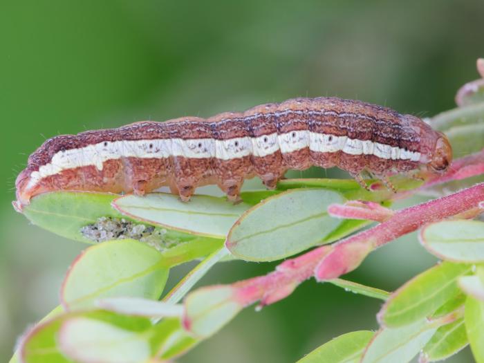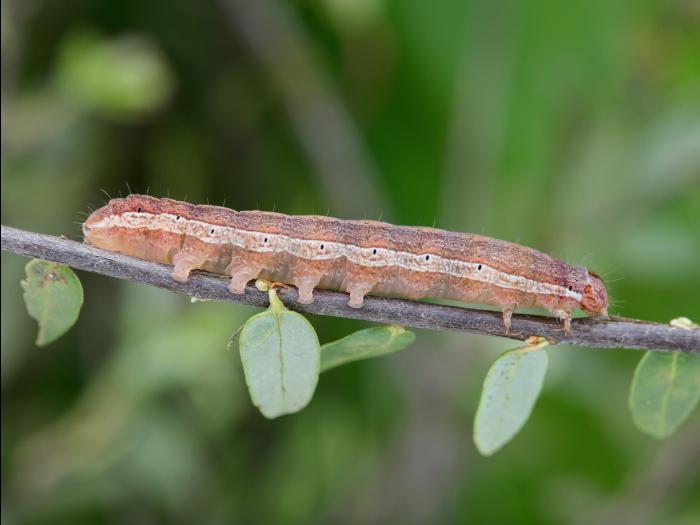 Larve : 40,0 mm à maturité; le corps est brun orangé; la tête est rougeâtre; trois lignes longitudinales noires sont présentes sur le dos et la bande latérale est large et blanche; les stigmates sont à l’intérieur de cette bande.