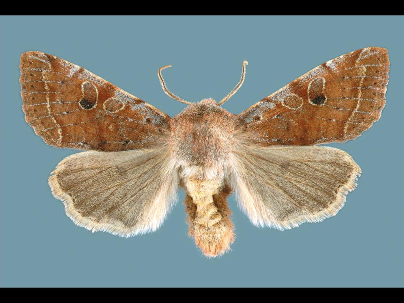 Adulte : envergure des ailes de 38,0 à 43,0 mm; la tête et le thorax sont gris brun et poilus; les ailes antérieures sont brunes avec des taches grises diffuses sur la marge antérieure; la tache réniforme présente un point noir; la ligne submarginale est blanche; les ailes postérieures sont uniformément grises avec une frange pâle.