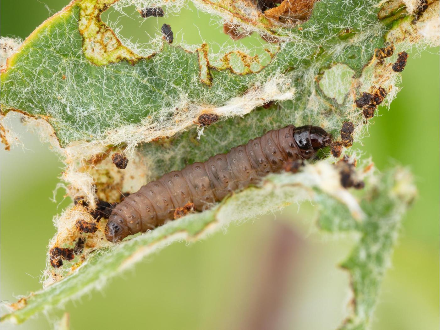 Les femelles pondent leurs œufs individuellement sur la face supérieure ou inférieure du feuillage. Les œufs éclosent après une dizaine de jours. Les jeunes larves s'alimentent principalement sur la face inférieure des feuilles, à proximité de la nervure principale, sous une couverture de soie. Certaines larves sélectionnent un site où une feuille est en contact avec un fruit. Ces larves vont généralement s'alimenter du fruit ainsi que du feuillage. Lorsqu'elles atteignent le troisième stade, les larves quittent leur site d'alimentation pour construire l'hibernaculum dans lequel elles passeront l'hiver.