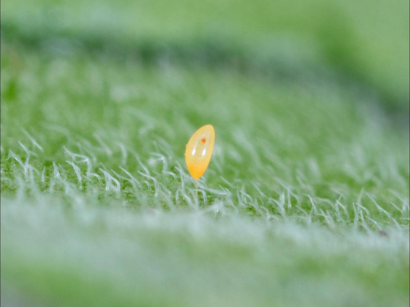 Oeuf : 0,32 à 0,34 mm; fusiforme; de couleur jaune pâle à orangé; suspendu à la feuille par un pédoncule mesurant entre 0,48 et 0,51 mm.