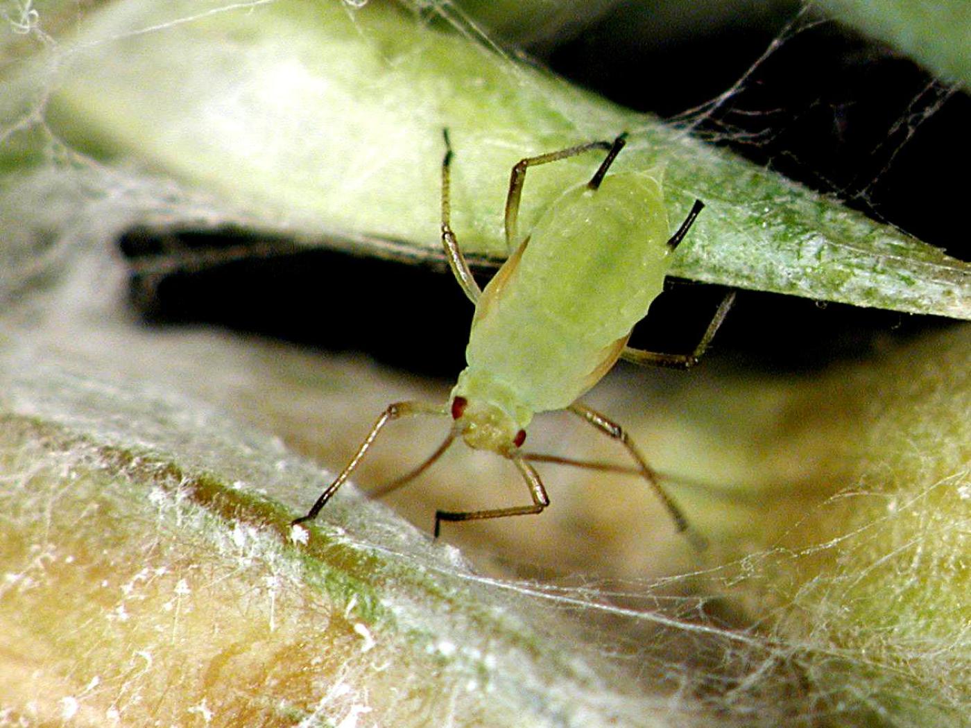 Larve : 1,0 à 1,5 mm; le corps est vert; les yeux sont rouges; les antennes et les pattes sont brunes ; les cornicules sont noires; la queue est pâle.