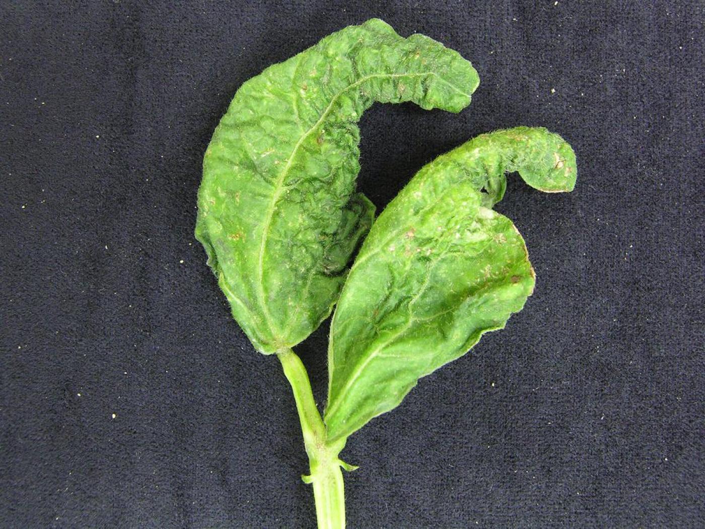 Feuilles de haricot présentant des dommages causés par le puceron du soya : à l'aide de leurs pièces buccales de type piqueur-suceur, les pucerons transpercent la cuticule des feuilles et des pétioles et absorbent la sève, ce qui stresse le plant. Cela entraîne l’enroulement des feuilles, le ralentissement de la croissance des plants, la sénescence hâtive, une diminution du nombre de gousses ainsi qu’une diminution du nombre de graines par gousses.