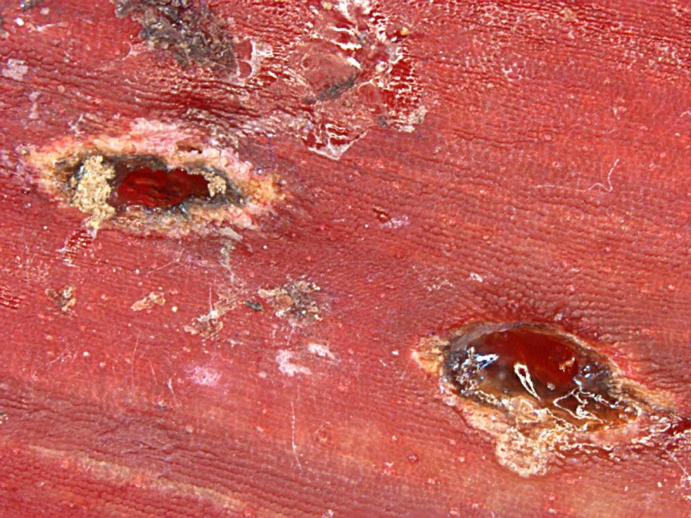 Description: Gros plan de deux piqûres sur le pétiole d'une feuille de rhubarbe : la larve et l'adulte piquent la plante et injectent une enzyme entraînant la nécrose des tissus, puis se nourrissent des fluides. Ce type de dommage est commun dans la culture du céleri, mais peu documenté sur la rhubarbe.