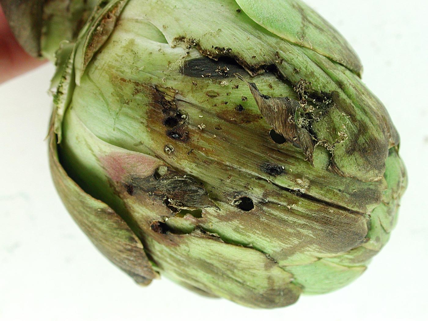 Description: Fleur d'artichaut attaquée par une larve de pyrale du maïs : lorsqu'elle s'attaque à la fleur d'artichaut, Ostrnia nubilalis creuse une galerie qui traverse les multiples sépales. On observe donc un ou plusieurs trous ainsi que des fèces sur chacun des sépales traversés par la galerie.