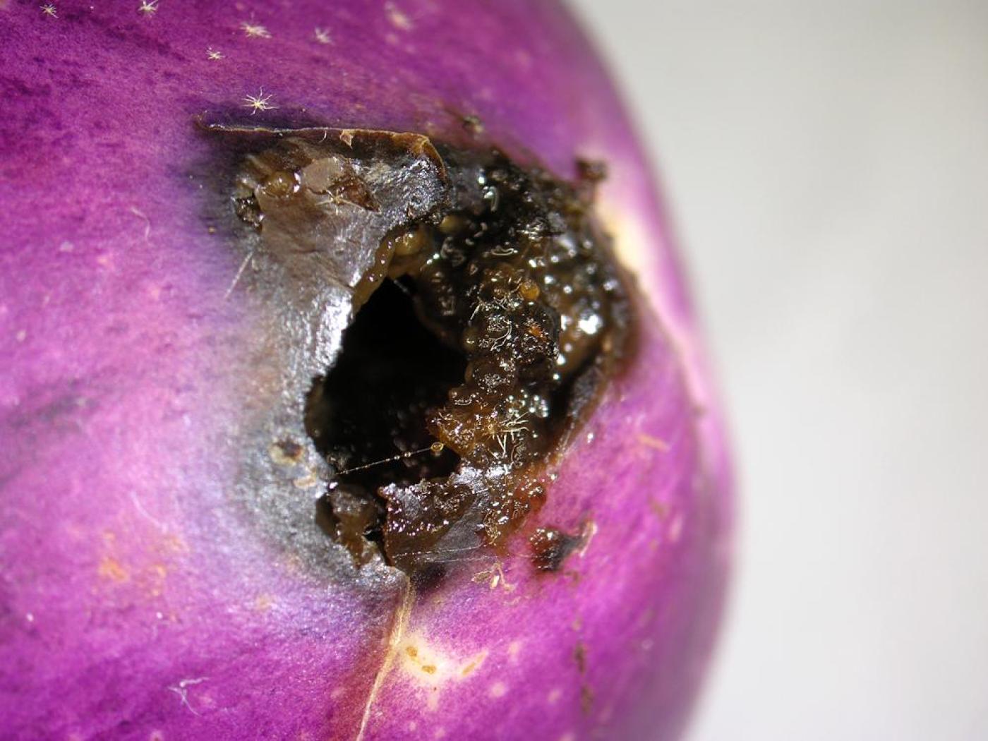 Description: Dommage de la pyrale du maïs sur une aubergine : Ostrinia nubilalis, bien qu'elle ne s'attaque qu'assez rarement aux cultures d'aubergines, peut creuser des galeries dans les tiges ou dans les fruits pour s'en nourrir ou simplement pour se réfugier dans une cavité pour la période hivernale. Les tissus en périphérie de la galerie ont tendance à se nécroser rapidement.