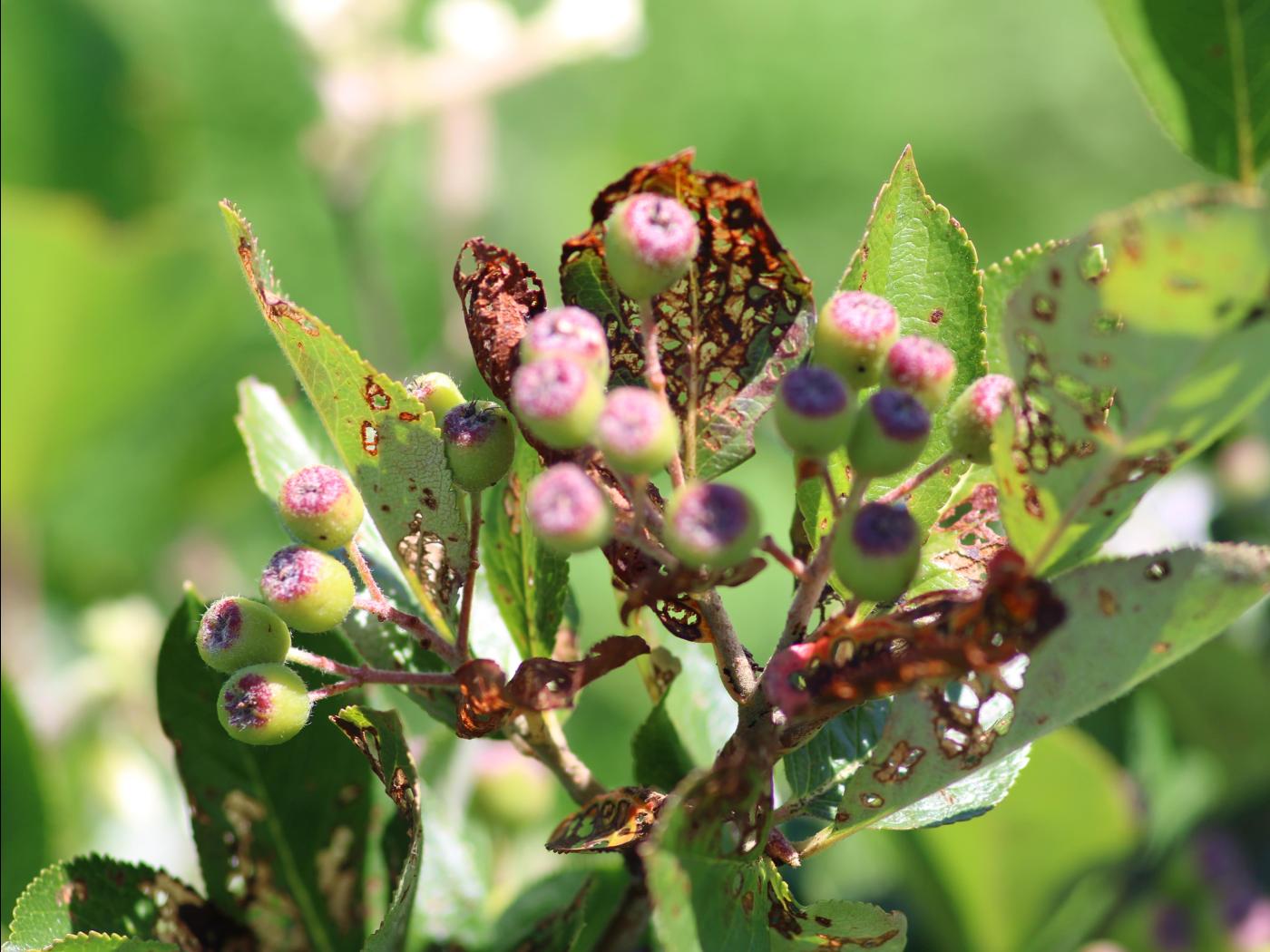 Description: Dommages typiques d’une feuille d’aronia squelettisée à la suite du passage de scarabées japonais adultes. Les fruits peuvent être grignotés si la population de l’insecte est très forte.