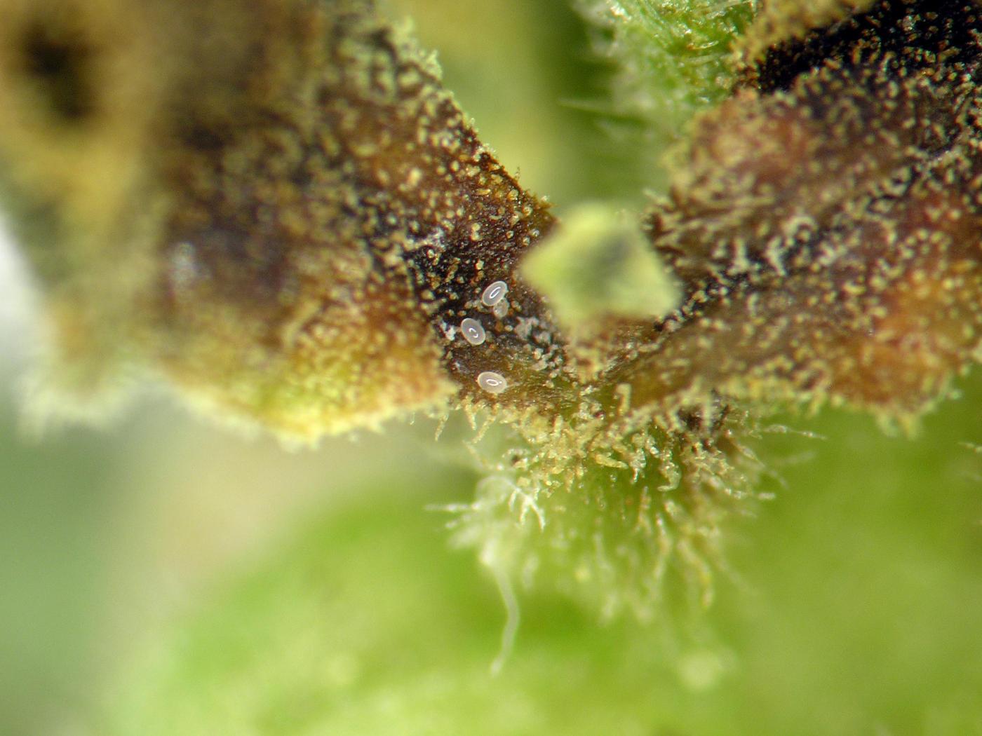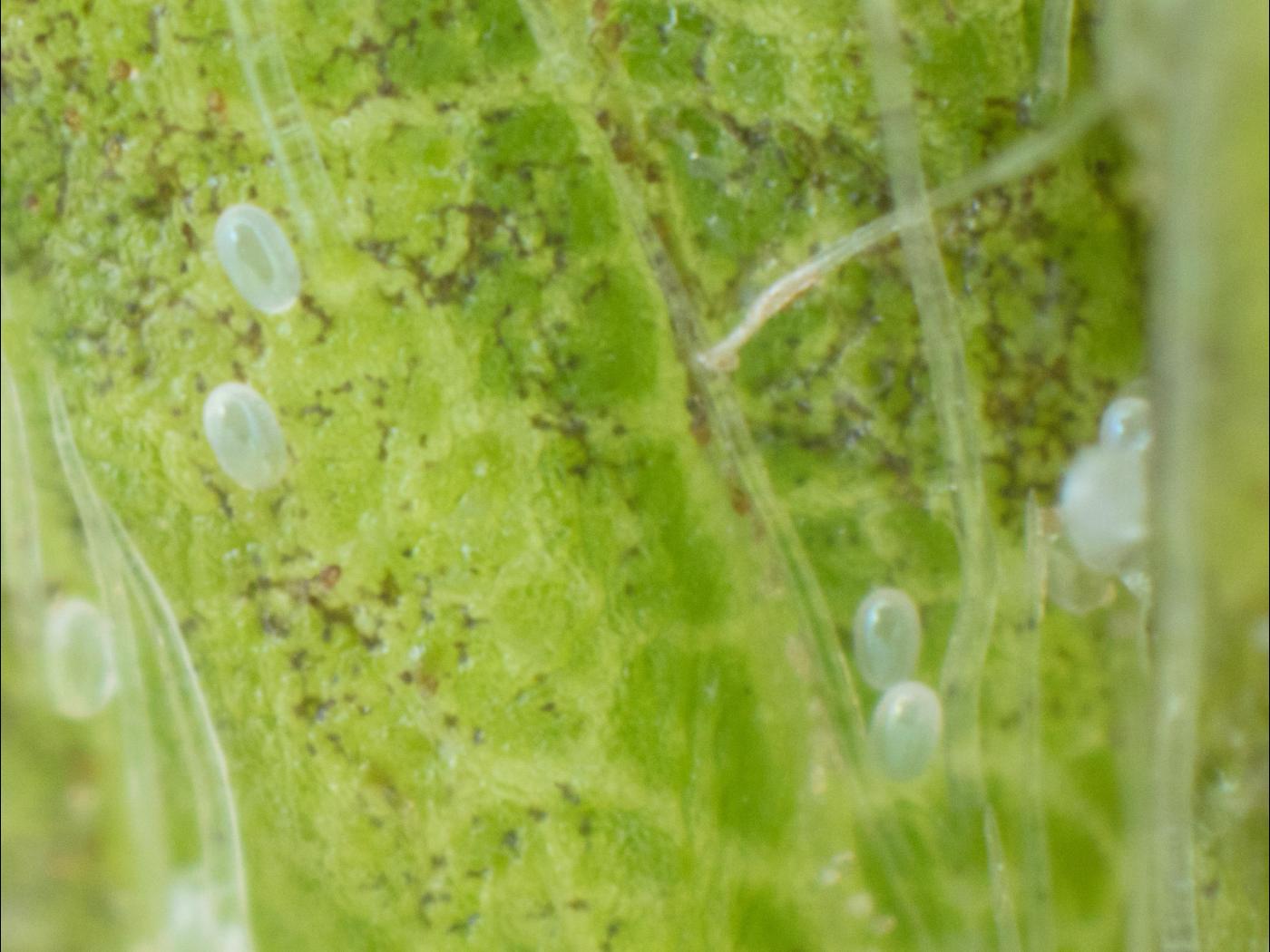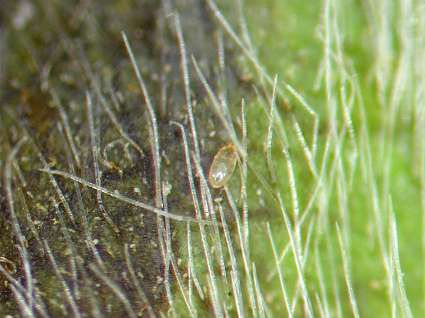 Légende: Adulte femelle au milieu des trichomes d'une feuille de fraisier