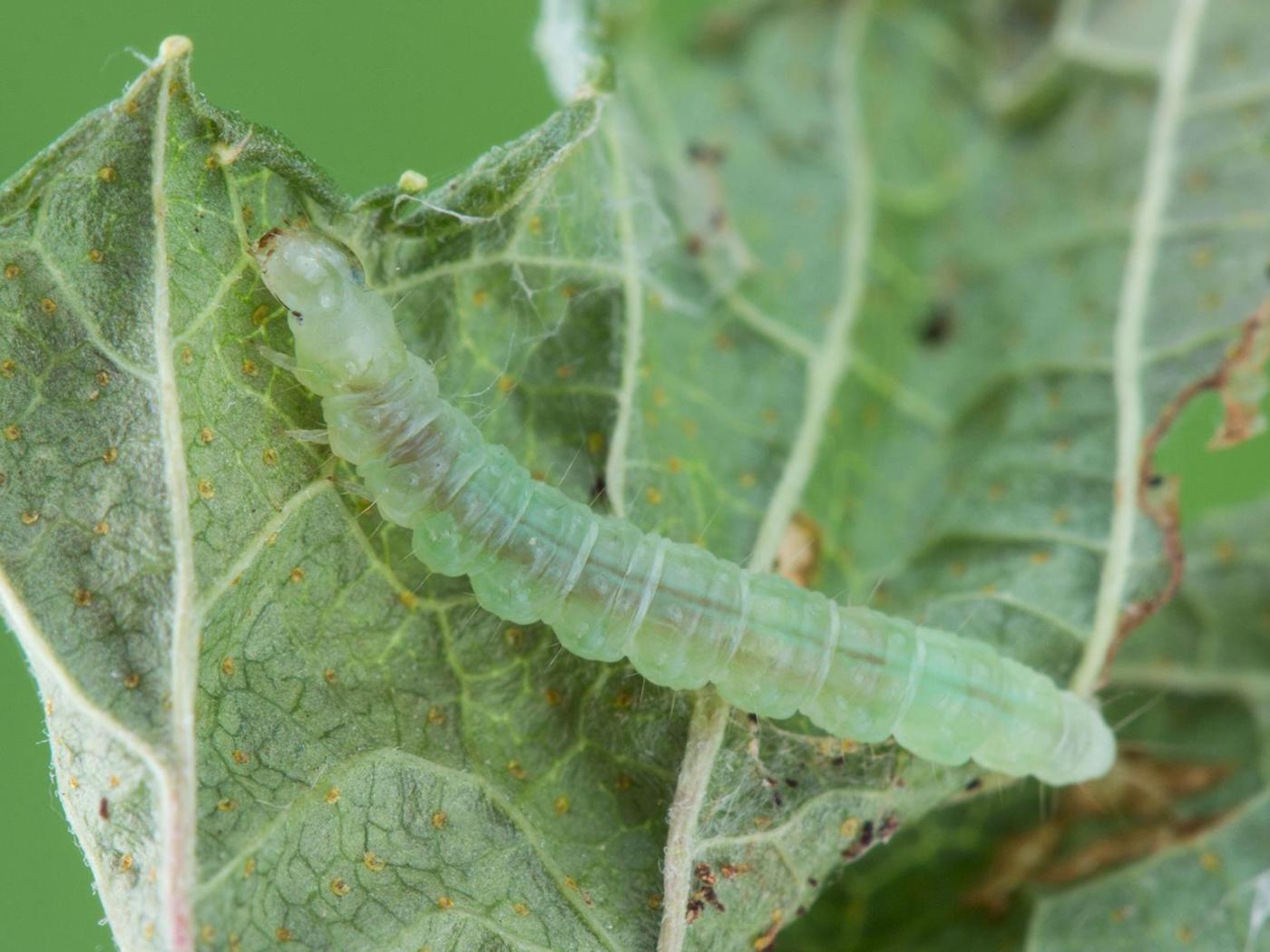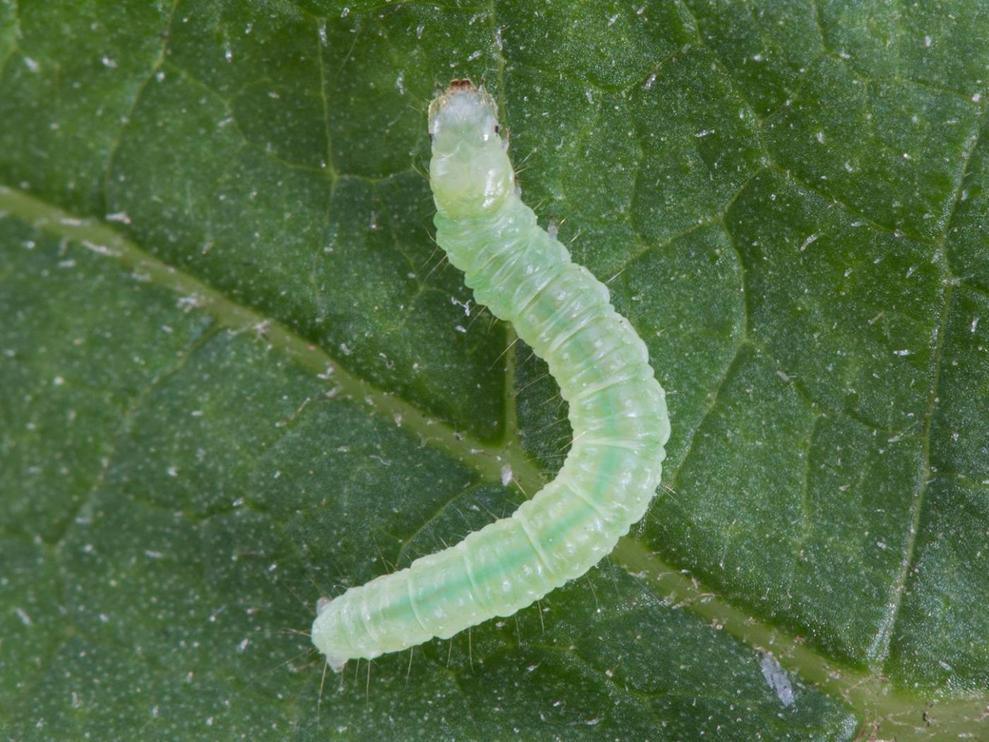 Larve : 17,0 à 23,0 mm à maturité; la tête et la plaque thoracique sont jaune verdâtre tandis que le reste du corps est vert clair; une ligne verte un peu plus foncée est généralement présente au centre du dos; le corps est parsemé de quelques longues soies pâles surmontant de petits tubercules blanchâtres.
