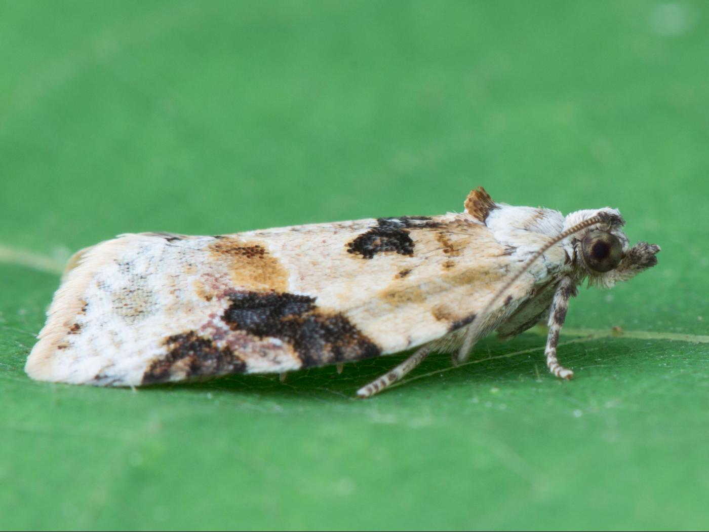 Adulte : envergure des ailes de 20,0 mm; la tête et le thorax sont blancs; une petite houppe de poils foncés est présente sur la section postérieure du thorax; les ailes antérieures sont principalement blanches ou gris pâle et présentent une large tache brun-noir partant de la marge antérieure des ailes ainsi qu’une tache brun pâle au centre de celles-ci; les ailes postérieures sont grises et sans taches.