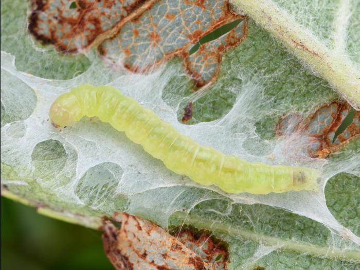 Les nouveaux adultes émergent quelques semaines plus tard, vers le début du mois de juillet. Après s’être accouplées, les femelles pondent à leur tour. Contrairement à la première génération qui pondait sur le bois de l’arbre, la seconde dépose ses œufs directement sur le feuillage. Ces derniers éclosent au mois d’août et les jeunes larves qui en sortent se nourrissent du feuillage et des fruits. À l’approche de la maturité, elles commencent à enrouler des feuilles ensemble à l’aide de soie afin de se former un abri. C’est là qu’elles se transformeront en chrysalide en octobre ou en novembre et qu’elles hiberneront durant l’hiver.