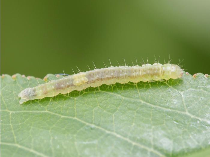 Larve: 15,0 à 17,0 mm; le corps est vert pâle ou légèrement jaunâtre; la tête est verdâtre lorsque la larve est jeune et elle devient brun pâle par la suite.