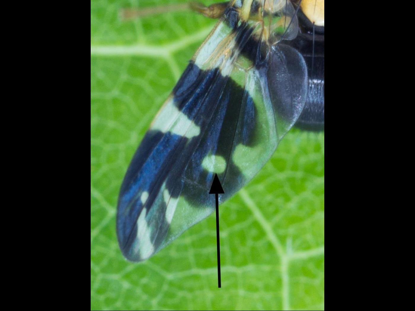 Adulte : 3,0 à 4,0 mm; la tête est arrondie et principalement jaune et orangée; le thorax et l'abdomen sont noirs, mis à part le scutellum ainsi qu'une bande sur les côtés du thorax qui sont jaunes; les ailes présentent un motif noir caractéristique de cette espèce dans lequel une tache hyaline arrondie est présente.