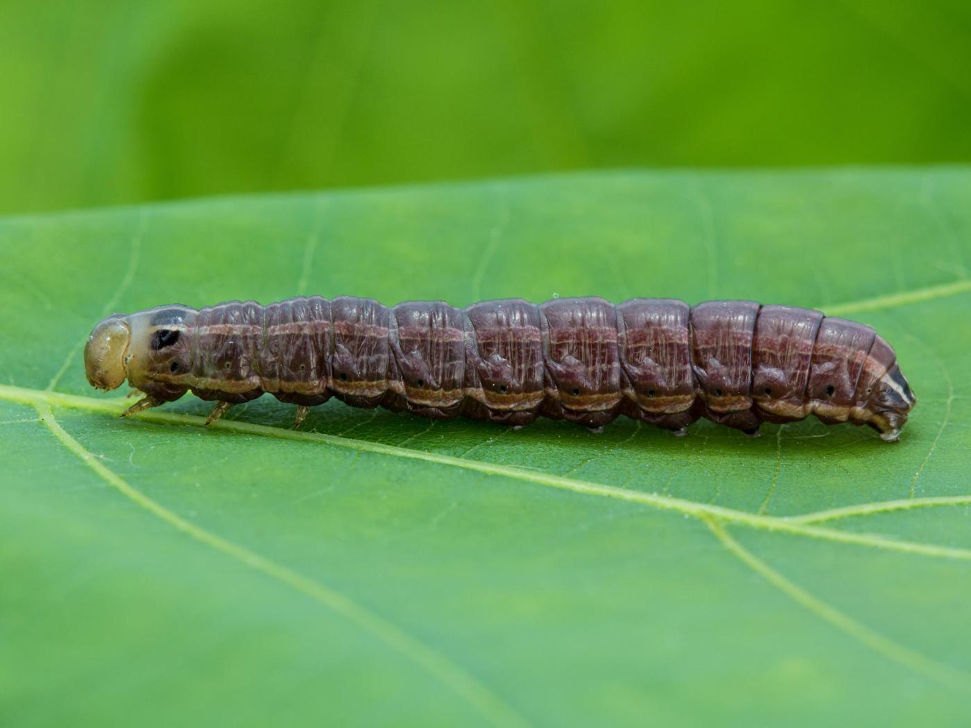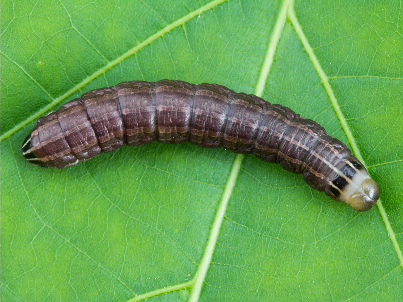 Larve : jusqu'à 45,0 mm à maturité; la tête est jaunâtre; le corps est brun foncé ou bronze et parfois noir; cinq lignes pâles de largeur égale traversent le corps du thorax à l'abdomen; les lignes sont bien visibles sur la plaque thoracique et sur la plaque anale.