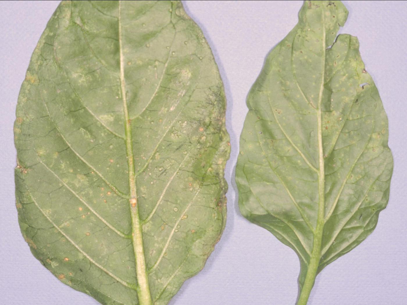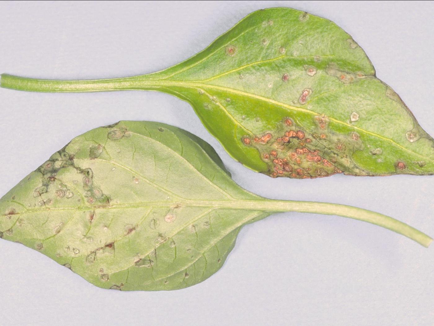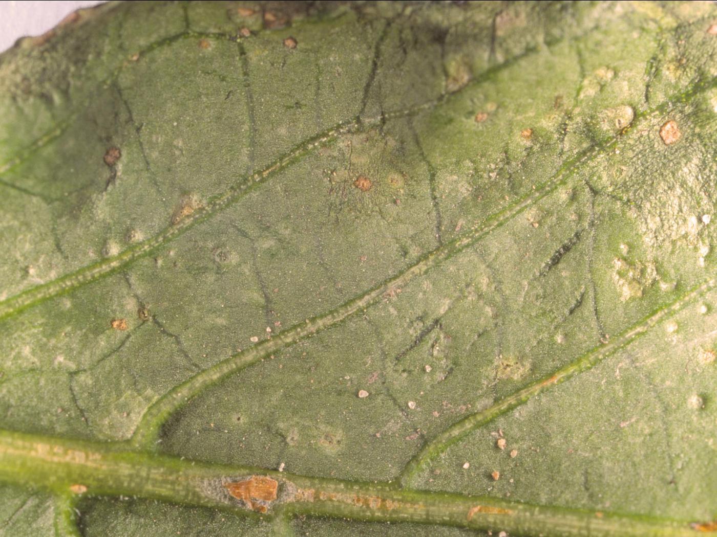 Feuille : les dommages débutent par de minuscules taches blanchâtres (1 à 2 mm de diamètre), légèrement surélevées, avec un point brun au centre. Ces taches sont visibles à la face inférieure des feuilles. Par la suite, les taches s’agrandissent, s’affaissent, deviennent brunâtres et prennent une apparence liégeuse. Elles peuvent être ou non entourées d’un halo jaune ou blanc. La face supérieure devient également infectée avec le développement de la maladie.