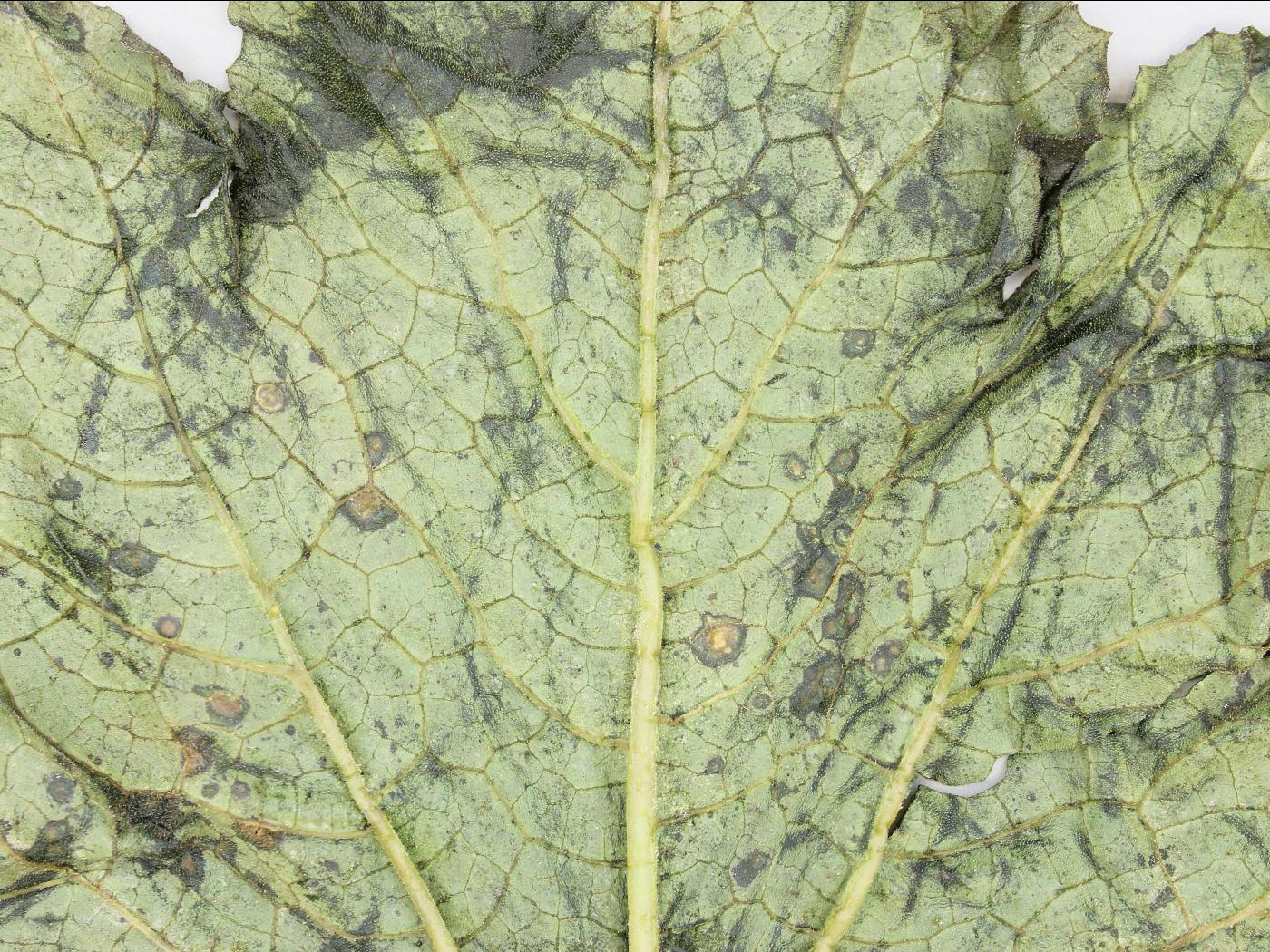 Feuille : sur les jeunes feuilles, les taches sont petites, aqueuses et plutôt rondes. Sur les feuilles plus âgées, les taches deviennent angulaires et délimitées par les nervures, jaunâtres à brunâtres et sèches. Par temps humide, un exsudat laiteux peut apparaître à la face inférieure. Le centre de la tache peut également tomber, donnant à la feuille une apparence criblée. Sur les cultivars sensibles, les taches ou les lésions sont souvent bordées d’un halo jaune.