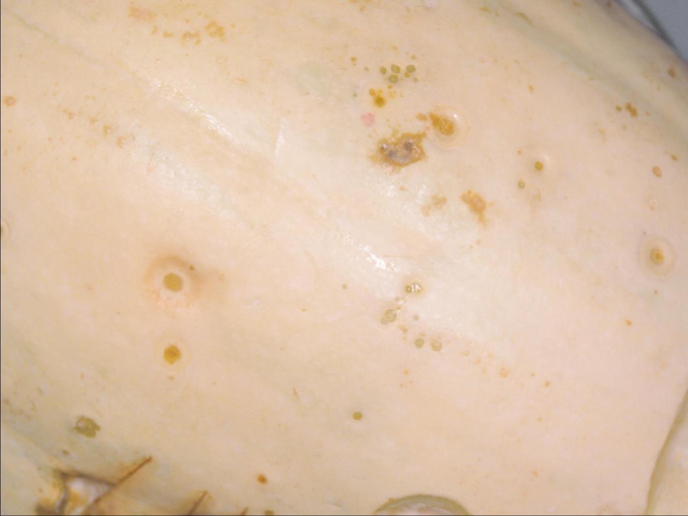 Fruit : les taches sont plus petites (1 à 3 mm) que celles observées sur les feuilles. Elles sont ovales à rondes, aqueuses, beiges à brunes, puis finissent par sécher et se fendre. Les taches sont généralement superficielles, mais peuvent se développer en profondeur si des infections secondaires (pourriture molle) se produisent. Les graines sont alors contaminées.