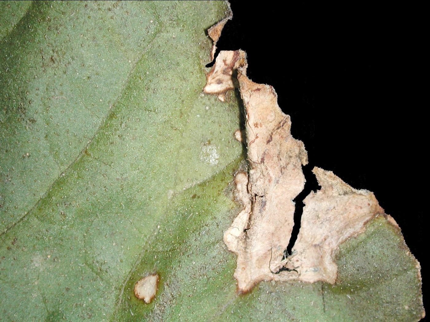 Feuille : sur les jeunes feuilles, les taches sont petites, aqueuses et plutôt rondes. Sur les feuilles plus âgées, les taches deviennent angulaires et délimitées par les nervures, jaunâtres à brunâtres et sèches. Par temps humide, un exsudat laiteux peut apparaître à la face inférieure. Le centre de la tache peut également tomber, donnant à la feuille une apparence criblée. Sur les cultivars sensibles, les taches ou les lésions sont souvent bordées d’un halo jaune.