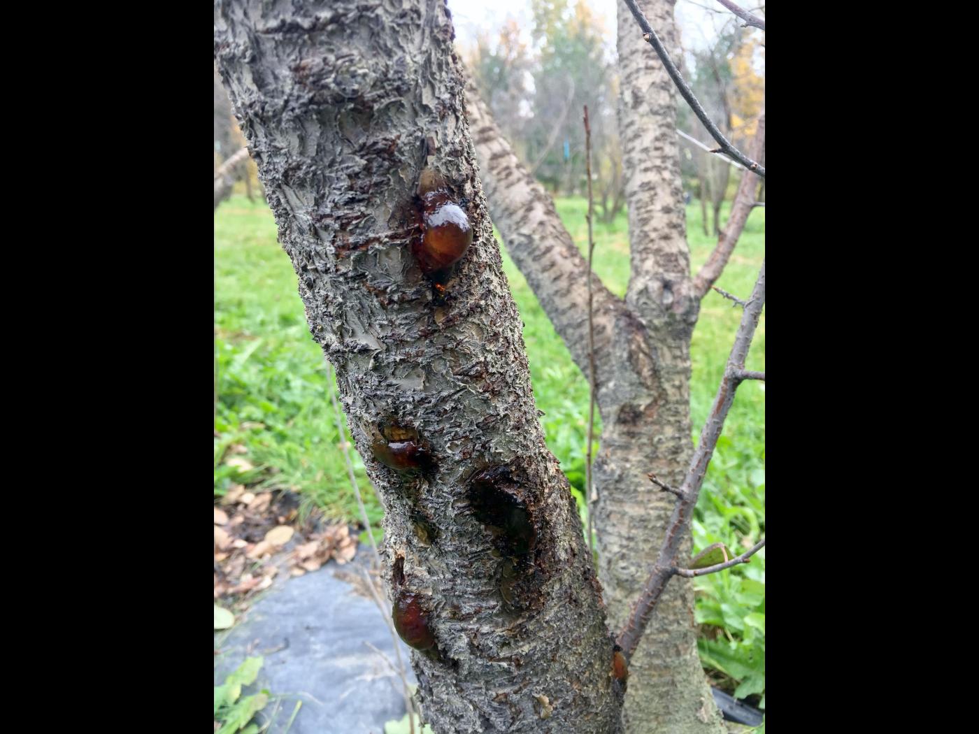Les chancres qui se forment sur les branches charpentières et sur le tronc sont généralement associés à la présence de gommose, un exsudat collant qui suinte de l’écorce au printemps. Certains peuvent s’agrandir de façon importante, ceinturer les branches et le tronc, et causer le dépérissement de l’arbuste. Les cerisiers qui cumulent plusieurs chancres dépérissent rapidement.