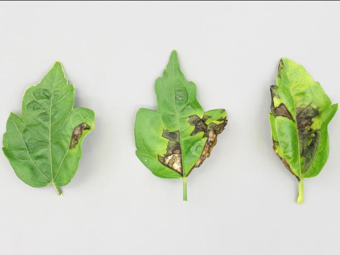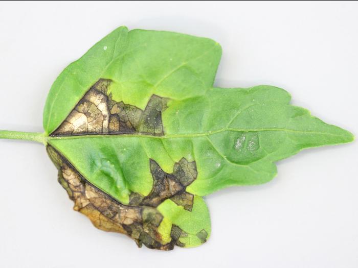 Feuille : présence de petites taches humides, gris foncé à brun foncé à noires, d'une forme variée (circulaire, elliptique ou angulaire), pouvant se regrouper pour former de larges zones nécrotiques. Les taches ont parfois une marge bien définie. Jaunissement potentiel des tissus avoisinants. Présence occasionnelle d’une brûlure marginale pourpre foncé à noire. Les feuilles peuvent être déformées. Les tissus atteints meurent, mais demeurent accrochés aux plants.