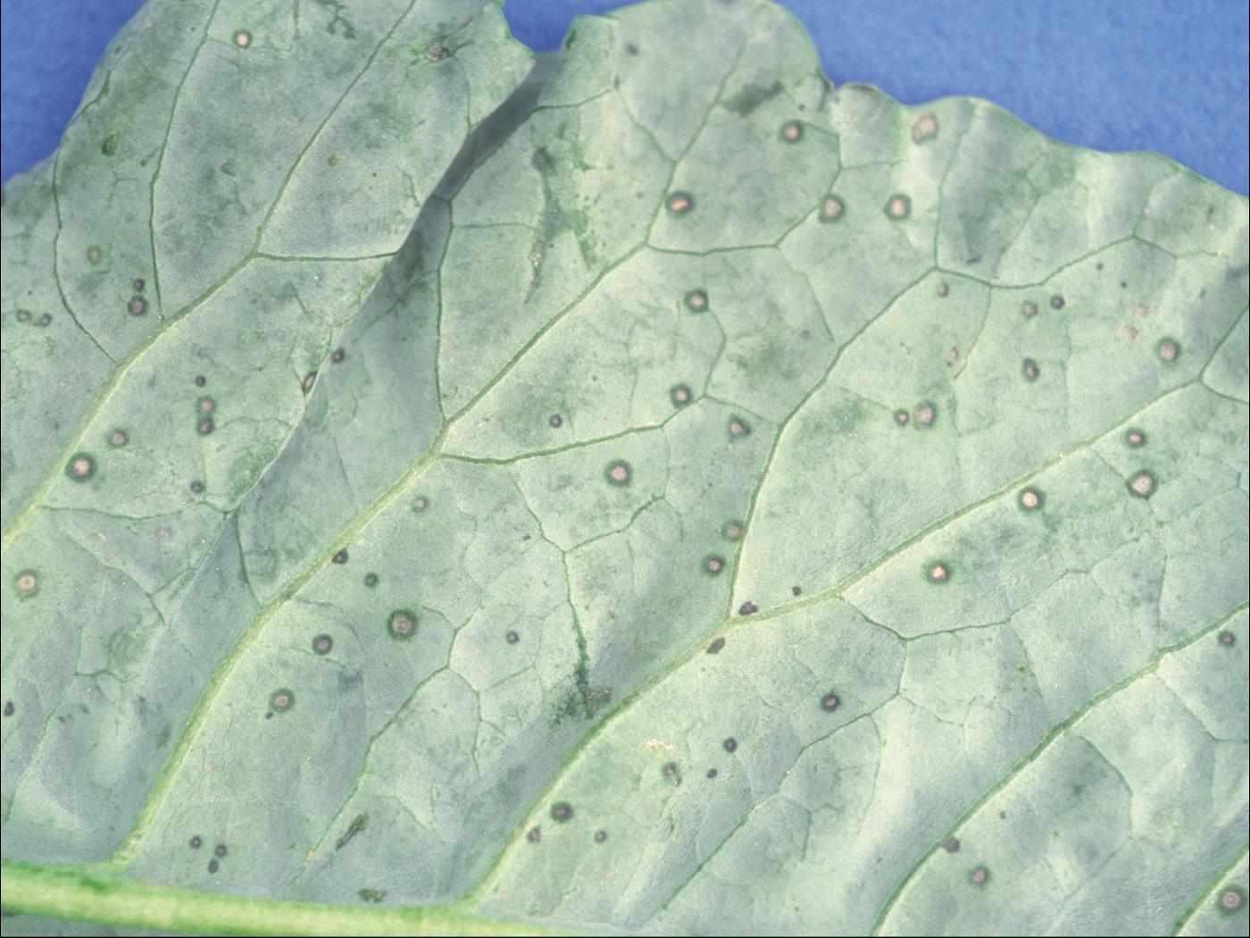 Description: À la face inférieure d’une feuille de brocoli provenant d’un champ, présence de nombreuses petites (Xanthomonas campestris pv. armoraciae, responsable de la tache bactérienne.