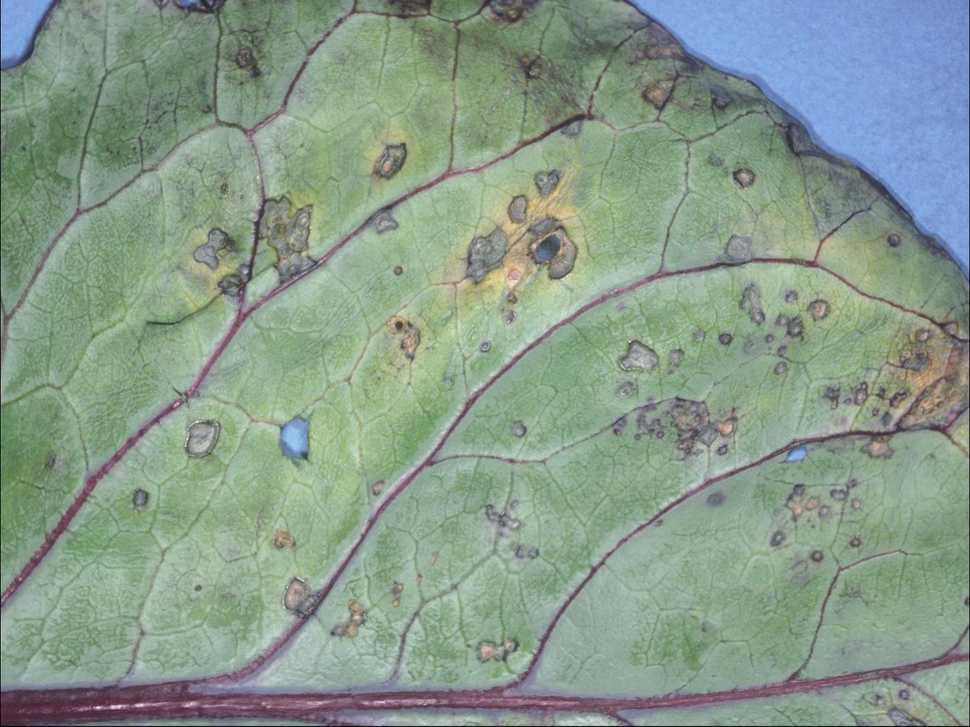 Description: À la face inférieure d’une feuille de chou rouge provenant d’un champ, présence de taches circulaires beiges à brunâtres avec une marge foncée et entourée ou non d’un halo jaune. Les taches sont réparties entre les nervures et elles sont souvent tombées. Les tests de laboratoire et de pouvoir pathogène sur des plantules de chou ont révélé la présence de la bactérie Xanthomonas campestris pv. armoraciae, responsable de la tache bactérienne.
