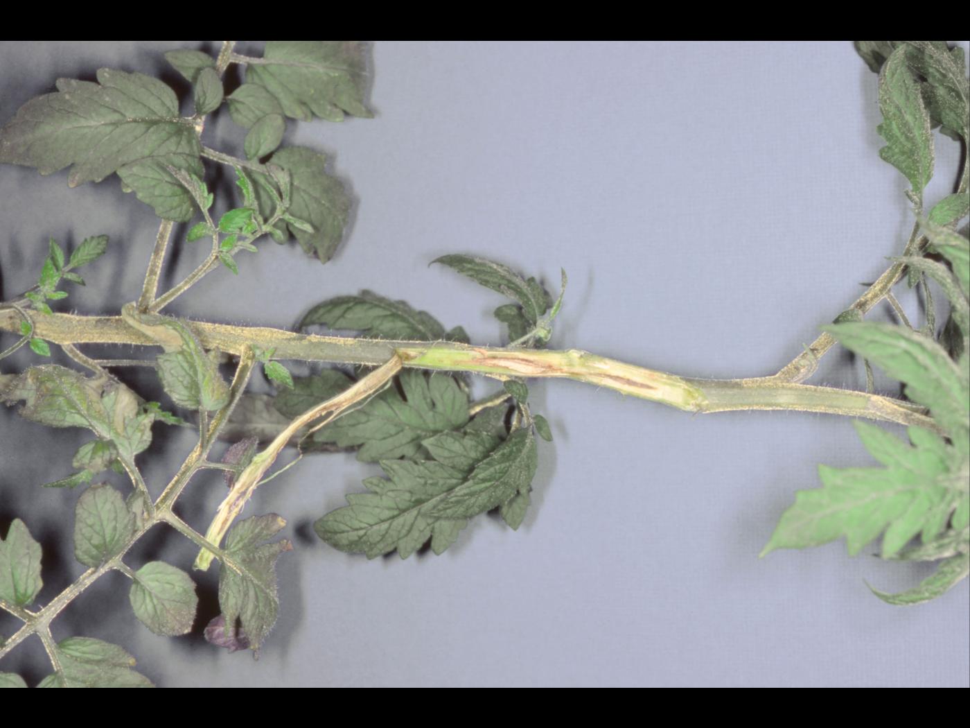 Description: Une section de tige d’un plant de tomate provenant d’une serre montre un chancre beige progressant sur un seul côté de la tige à partir d’un nœud. Les tests de laboratoire ont révélé la présence du champignon Acremonium strictum, responsable du chancre sec chez la tomate.
