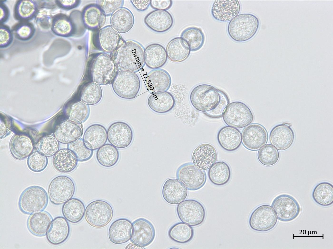 Sporangiophores : Cellules à la base des chaînes de sporanges, les sporangiophores sont hyalins, claviformes (en forme de massue) et ont d’épaisses parois. Dimensions : 30-45 x 15-18 μm.
