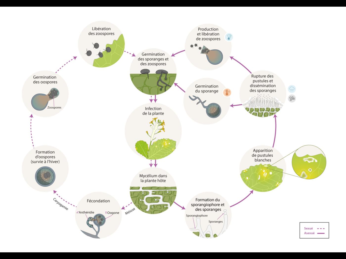 Le cycle de la maladie connaît un stade asexué qui génèrent les sporanges qui contribuent aux infections secondaires, et un stade sexué qui aboutit à la formation d’oospores nécessaires à la suivie hivernale.