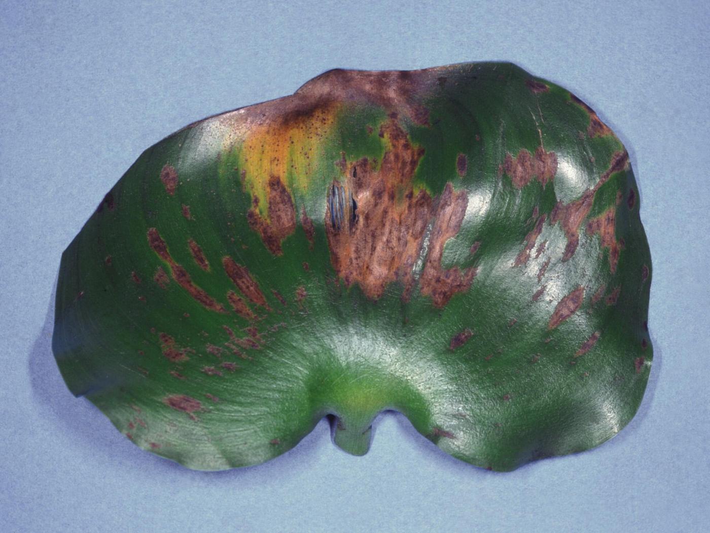 Feuille : présence de taches jaunes, brunes à noires sur le limbe. Les taches sont circulaires ou en anneau (tache en cible). Parfois présence d’une marge jaune ou foncée. Dans tous les cas, les infections foliaires causent une diminution de la photosynthèse (jaunissement), accélèrent la sénescence et la défoliation.
