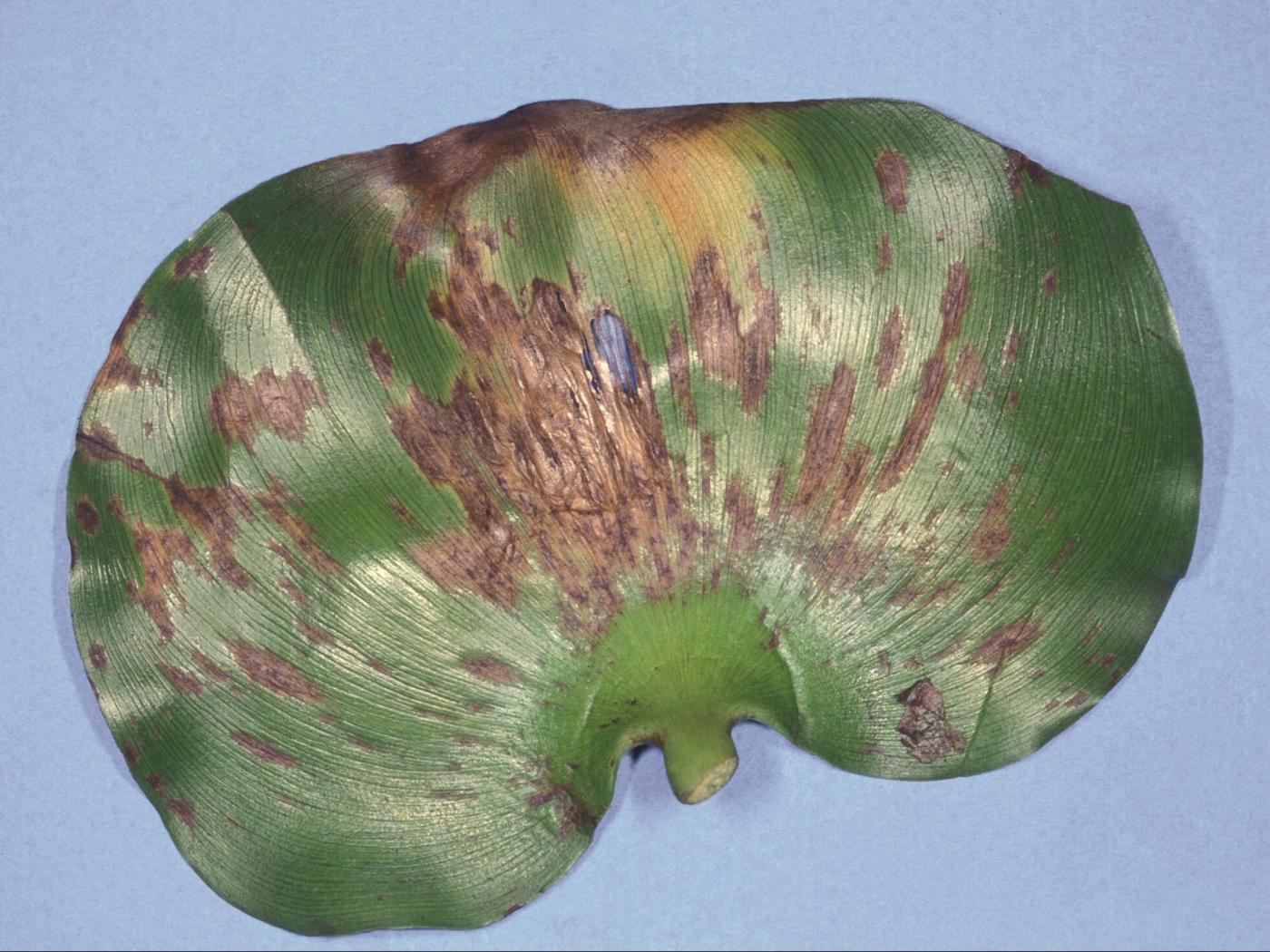 Description: À la face supérieure d’une feuille de jacinthe d’eau provenant d’un bassin d’eau, présence de taches brunes à noires, à contour bien délimité, de forme allongée et parallèles aux nervures. Ces taches mesurent environ 2 x 8 mm. Au centre du limbe, présence d’une grande plage brûlée d'aspect sec. Les observations microscopiques ont révélé la présence des champignons Alternaria sp. et Colletotrichum sp. Ces champignons causent respectivement des taches foliaires et de l’anthracnose.
