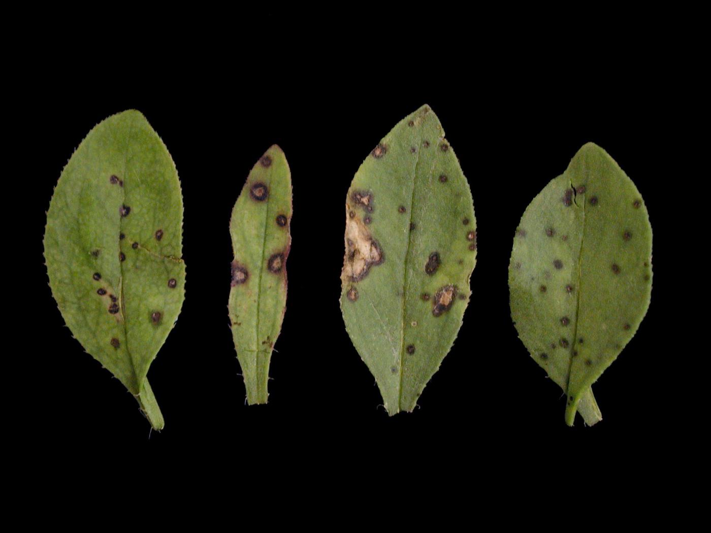 Feuille : présence de taches jaunes, brunes à noires sur le limbe. Les taches sont circulaires ou en anneau (tache en cible). Parfois présence d’une marge jaune ou foncée. Dans tous les cas, les infections foliaires causent une diminution de la photosynthèse (jaunissement), accélèrent la sénescence et la défoliation.