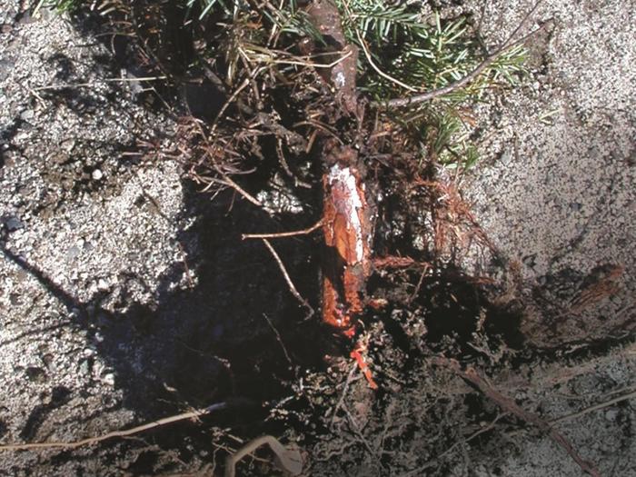 Le premier symptôme est un déclin de la vigueur de l'arbre. Les aiguilles jaunissent et brunissent progressivement. La croissance de l'arbre diminue, puis, avec le temps, il dépérit et peut mourir. Les arbres infectés peuvent être seuls ou en groupe et se trouvent fréquemment près de souches infectées plus vieilles ou en décomposition.