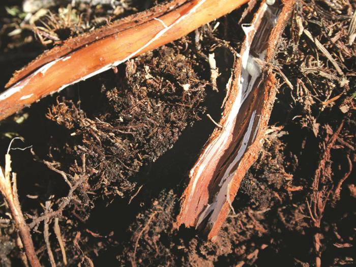 Les pourridiés sont des champignons qui provoquent des maladies affectant les racines et les pieds des arbres et qui causent leur dépérissement. Le pourridié-agaric, communément appelé armillaire, est le plus courant et comprend plusieurs espèces, dont la plus virulente est Armillaria solidipes. Le mycélium de Armillaria spp. prend la forme de rhizomorphes noirs qui attaquent l’aubier des sapins et qui peuvent traverser de longues distances sous l’écorce et entre les arbres. Certains de ces champignons agissent comme des agents phytopathogènes et peuvent s’attaquer aux racines saines des arbres; d’autres sont des parasites de faiblesse et dégradent le bois mort. On les retrouve surtout dans les endroits où des arbres ont été replantés entre des souches en décomposition.