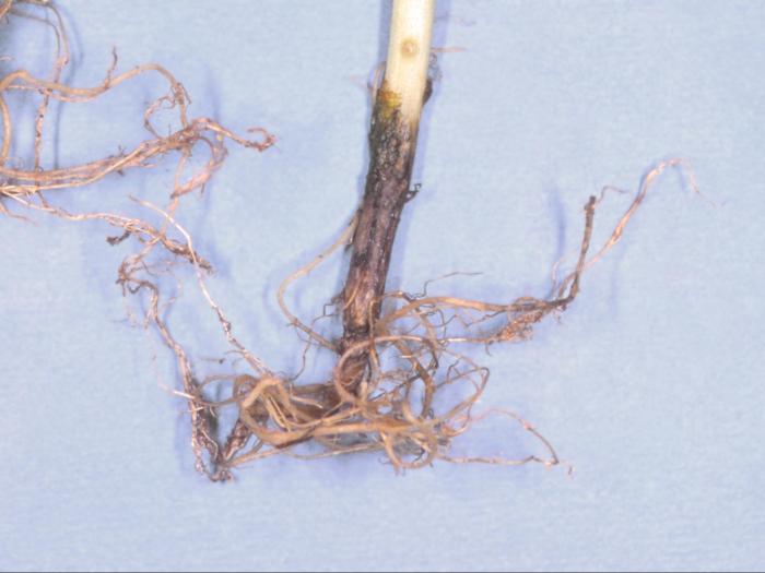 Racine : au début, présence de petites lésions rouges à brunes. Elles s’agglomèrent, forment des zones irrégulières de 3 à 20 mm de diamètre, sont distribuées au hasard sur l’épiderme et deviennent noires. Le système racinaire peut devenir complètement noir et pourrir. Les lésions sont superficielles ou entrent profondément dans le cortex. Retard de croissance de la racine pivotante.