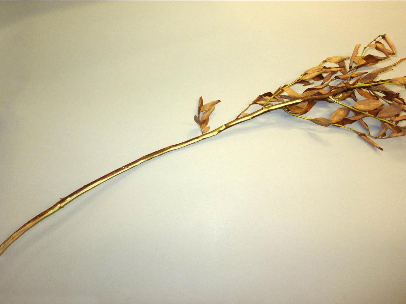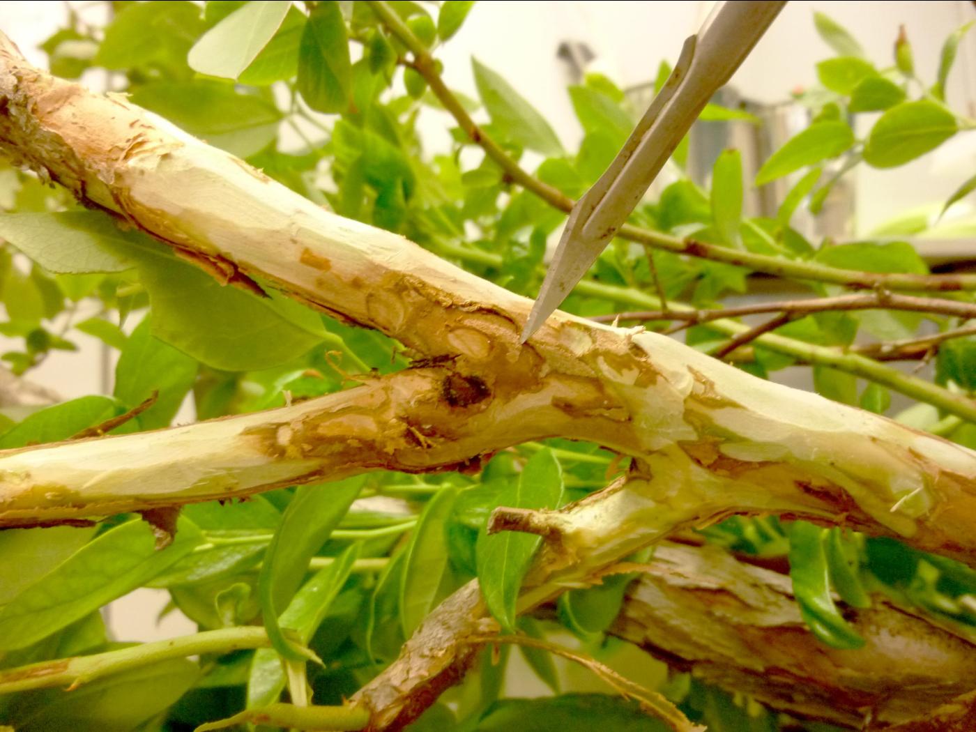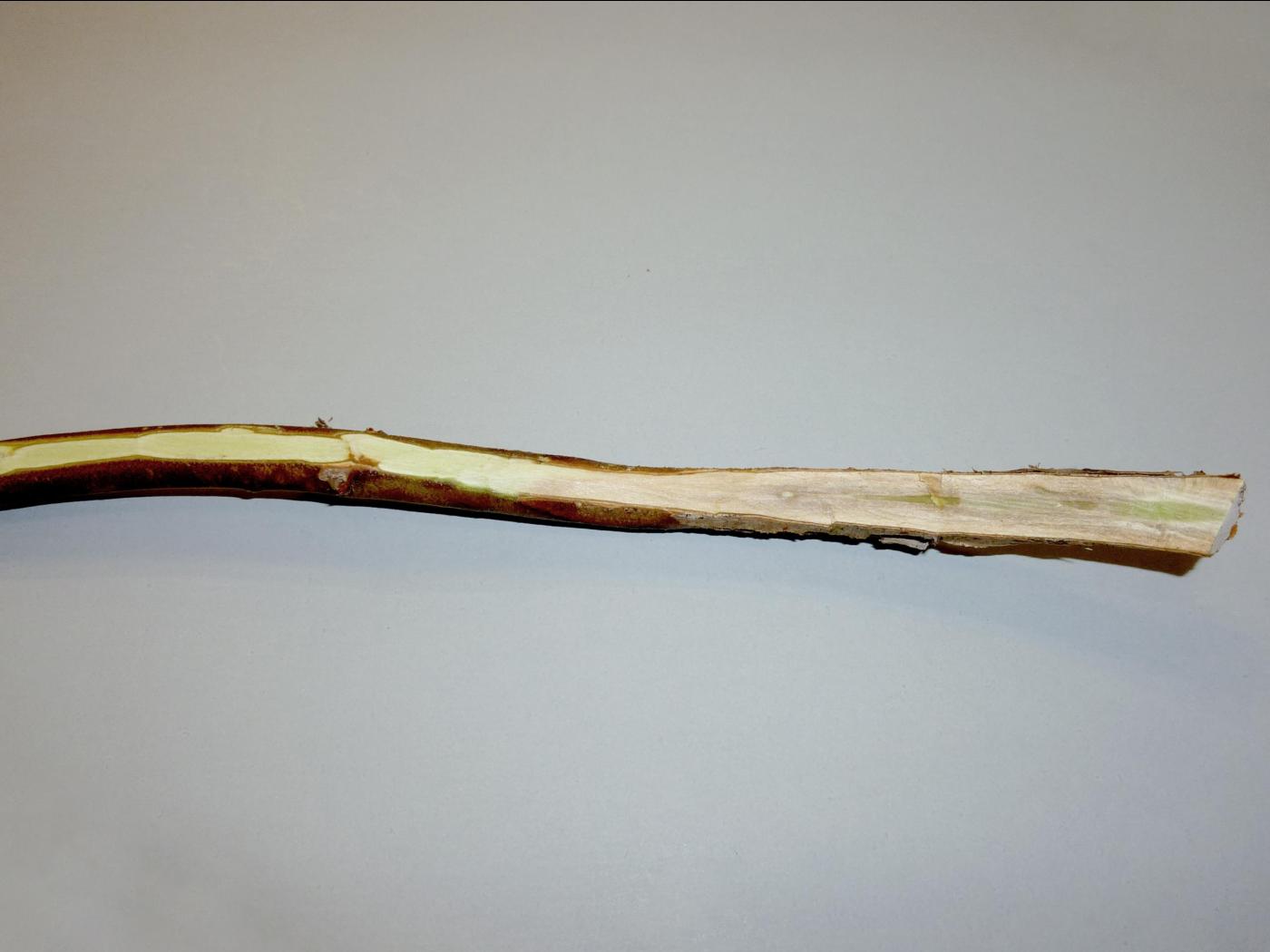 Tige : décoloration beige à brune du bois sous l’écorce, souvent sur un seul côté de la tige. Le brunissement est visible sur quelques cm de tige, mais parfois sur toute la longueur de la tige.