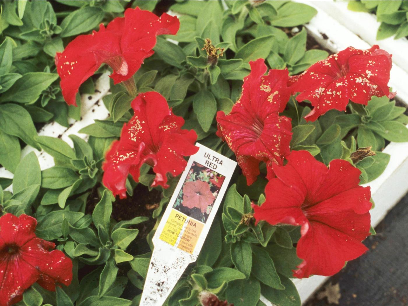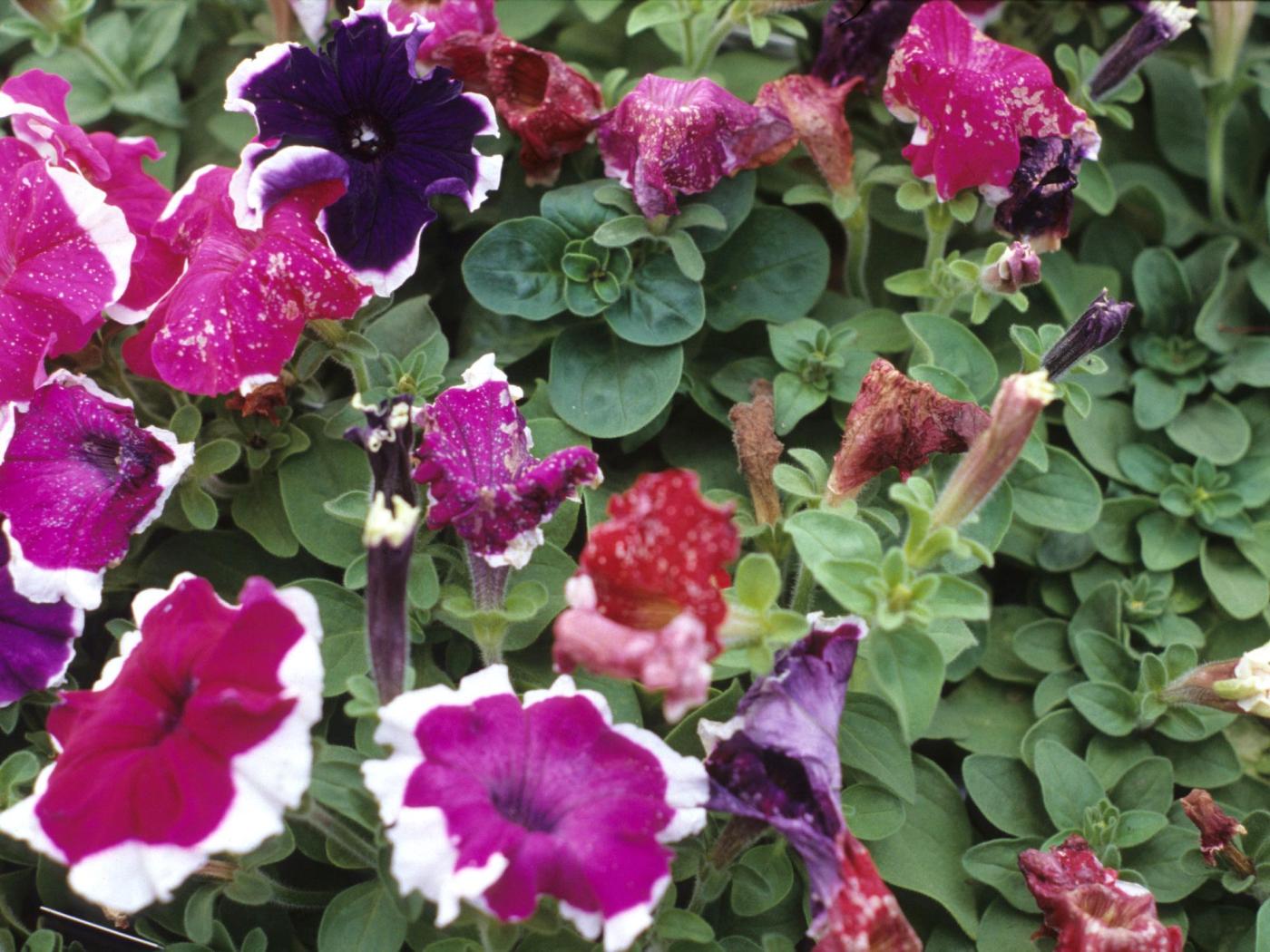 Fleurs : présence de fines taches décolorées, souvent brunes, sur les pétales ou les boutons floraux. Avortement, pourriture et chute potentielle des boutons floraux après l’infection.