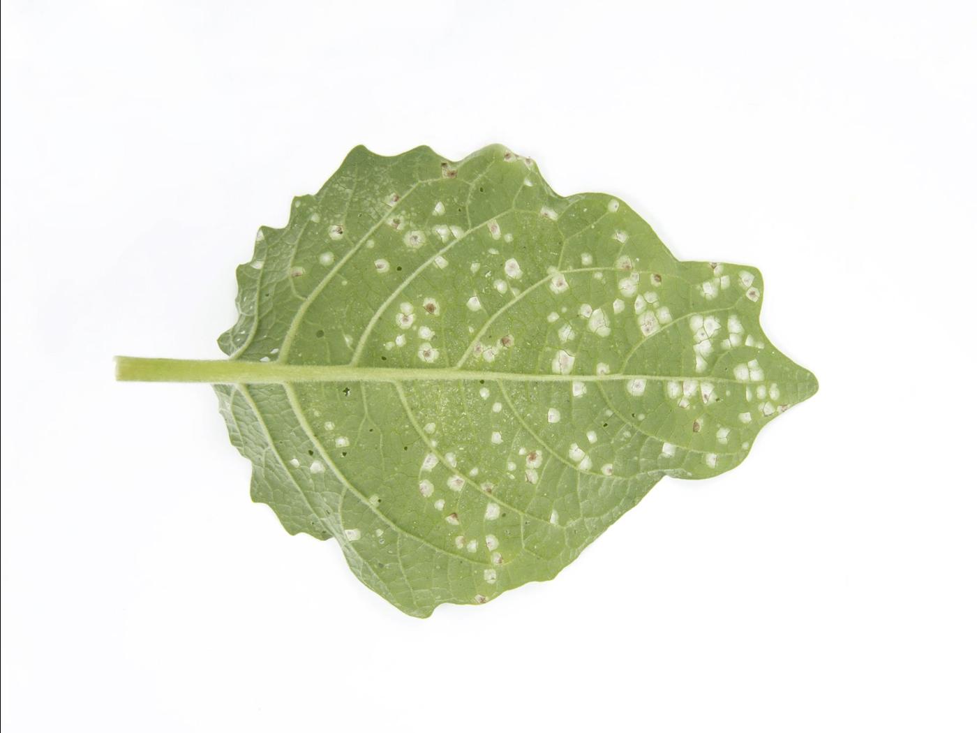 Feuille et pétiole : présence de taches circulaires à angulaires, beiges à brunes, sur lesquelles un mycélium blanc fructifie. Un halo jaune est souvent présent. En général, le mycélium blanc est observé à la face inférieure. Les vieilles feuilles sont affectées en premier et la maladie progresse ensuite vers les jeunes feuilles.
