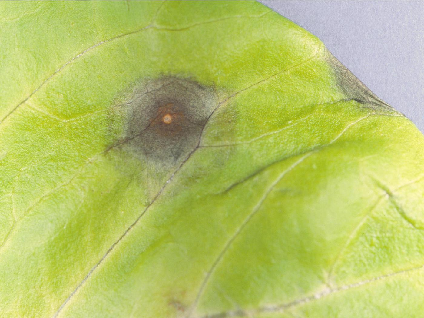 Feuille : présence de petites taches brunes entourées d’un halo vert pâle à jaune. En se développant, les taches deviennent beiges à brunes et irrégulières à angulaires. Un point blanc est fréquemment visible au centre des taches. Les taches ont un diamètre moyen supérieur à 1 cm et le centre des taches demeure pâle (0,5 à 1 mm de diamètre). Les grandes taches sont souvent localisées à la marge. Les taches bien développées sont légèrement déprimées et nécrotiques. Un duvet grisâtre, composé de structures fongiques du champignon, est parfois visible sur les deux faces de la feuille. Les tissus foliaires meurent lorsque la concentration de tache est trop élevée. Les symptômes se manifestent en premier sur les feuilles extérieures puis progressent vers les feuilles du cœur.