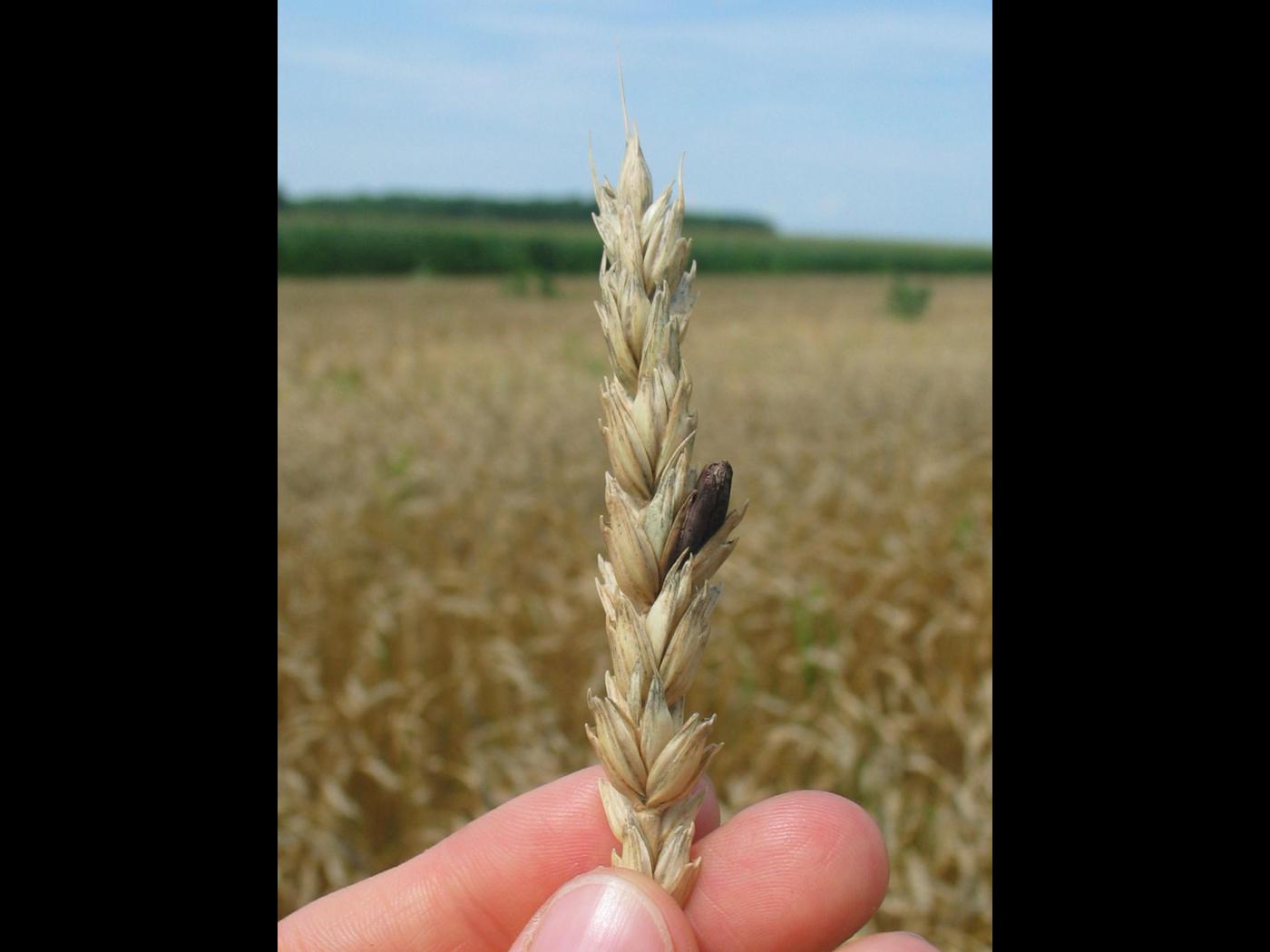 Description: Sur un épi de blé de printemps, présence d’un sclérote noir et dur à la place d’un grain. Ce symptôme est causé par le champignon Claviceps purpurea, responsable de l'ergot chez le blé de printemps.
