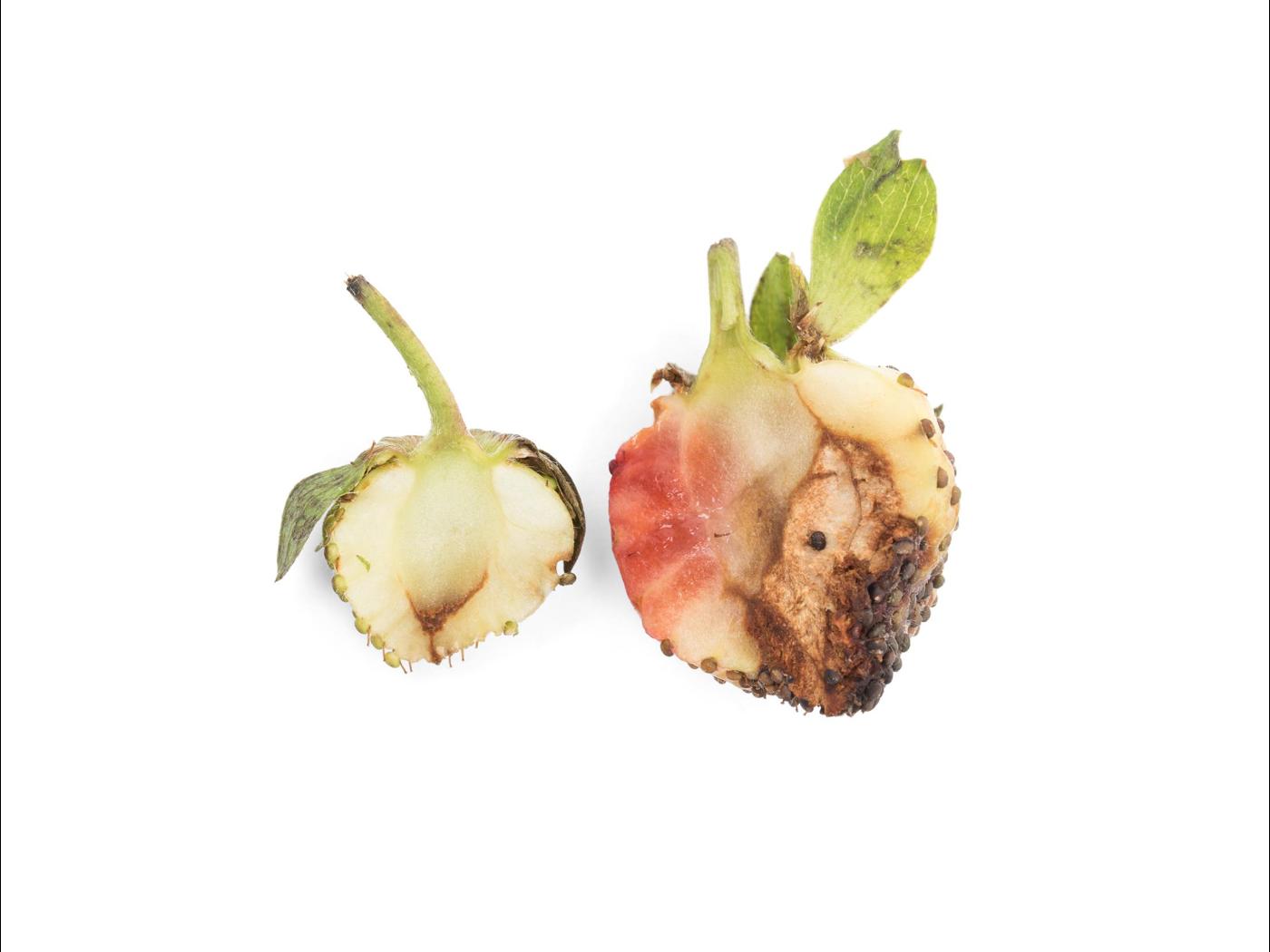 Fruit : au début, les taches sont petites, brun pâle, humides et superficielles. Elles deviennent brun foncé à noires, circulaires et déprimées. Les taches demeurent fermes. Sous des conditions humides, un exsudat rose crème à saumon se développe au centre des taches. Finalement, le fruit se dessèche, noircit et se momifie. Sur les fruits verts, la maladie se limite aux akènes qui deviennent noirs et creux. Éventuellement, le même type de tache se développera sur les fruits mûrissants.